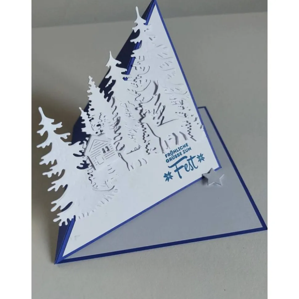 Stelle die Karte diagonal auf und erlebe, wie verschiedene ausgestanzte Bäume, Rehe und ein kleines Haus eine malerische Winterlandschaft erschaffen. Ein gestempelter Schriftzug und ein Stern, der das Dreiecksteil hält, machen sie zu einem echten Blickfang. Auf einem Sideboard oder Tisch aufgestellt, wird sie zur festlichen Dekoration.