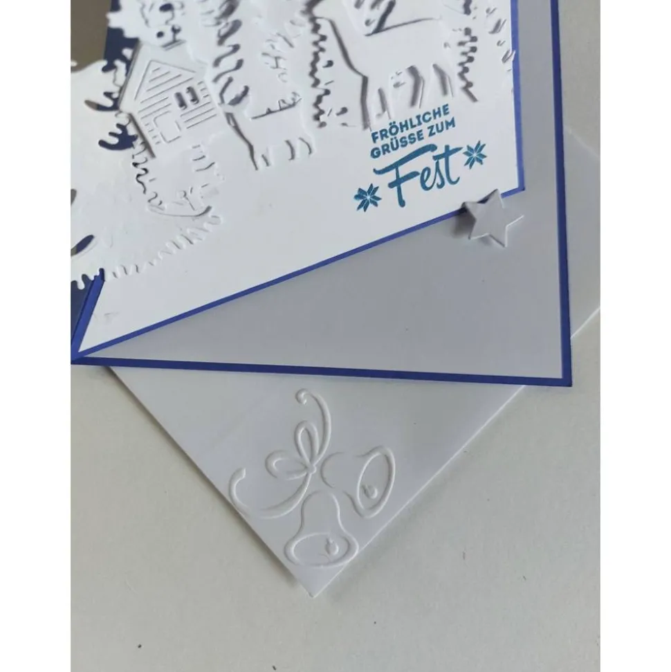 Das beiliegende Kuvert überzeugt mit einer weihnachtlichen Glockenprägung. Du erhältst die Karte mit Kuvert und schützender Klarsichthülle.