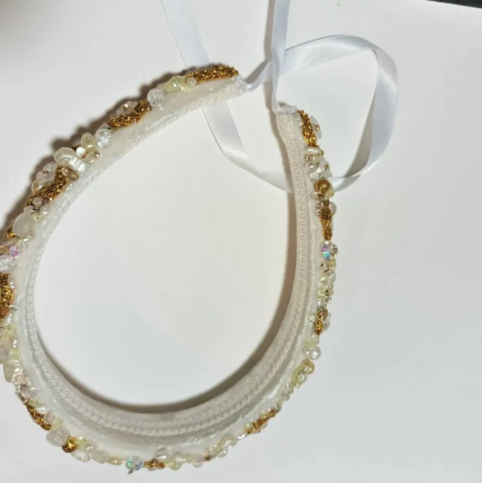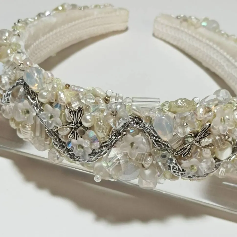 Entdecke den einzigartigen handgefertigten Haarreif als exklusiven Brautschmuck in weiß, creme, silber oder goldfarben! Jeder Haarreif ist ein kunstvolles Unikat, das von mir aufwendig handbestickt wurde. Du erhältst ein Meisterstück aus Seidensamt, bestickt mit kleinen Süßwasserzuchtperlen, Glasperlen, Kunstperlen, zarten Blüten, silberfarbenen Libellen und verschiedenen Roccailles.