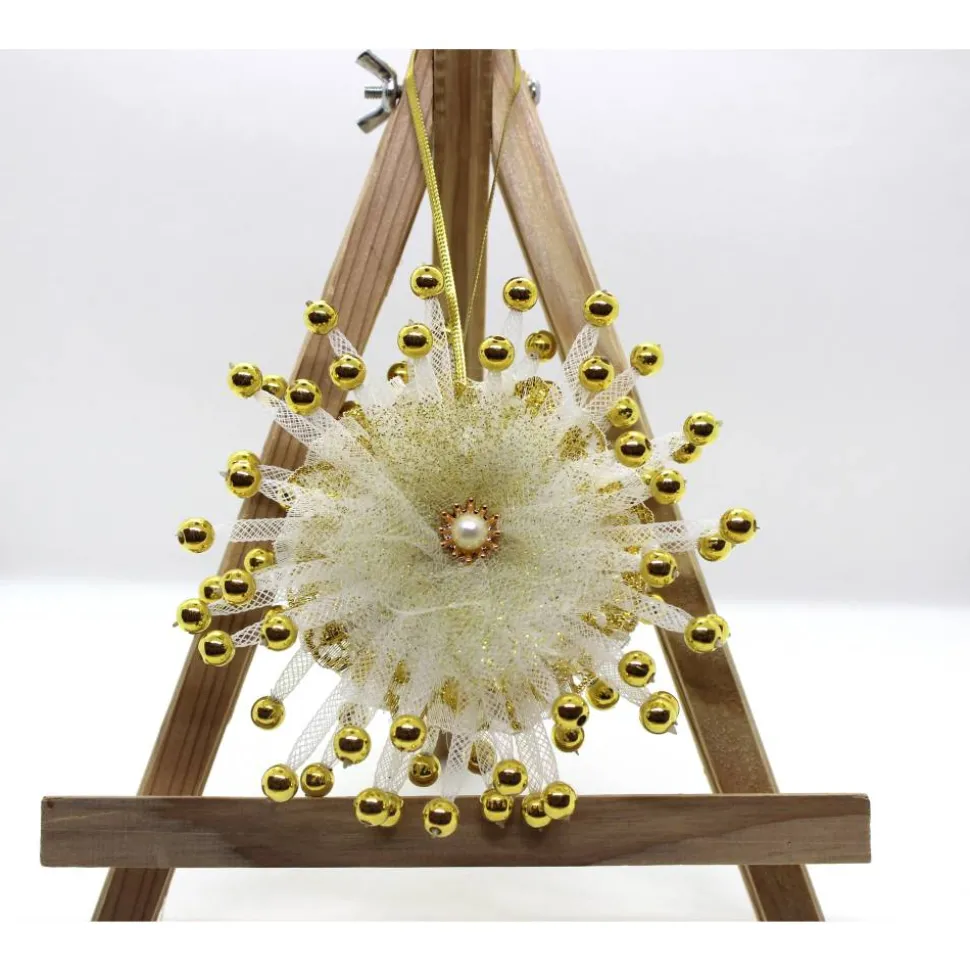 Der Stern ist aus funkelndem, goldglänzendem Tüll gefertigt und mit goldenen Kugeln akzentuiert, die ihm eine besonders festliche Note verleihen. Im Zentrum befindet sich eine liebevoll eingearbeitete Perle, die von einem filigranen Blütenmuster aus Glasperlen umgeben ist. Das Design strahlt Eleganz und Festlichkeit aus, perfekt für die besinnlichste Zeit des Jahres.