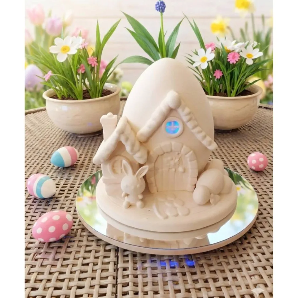 • Design: Verspieltes Haus in Eiform mit integriertem Hasen, Schornstein und runden Fenstern.