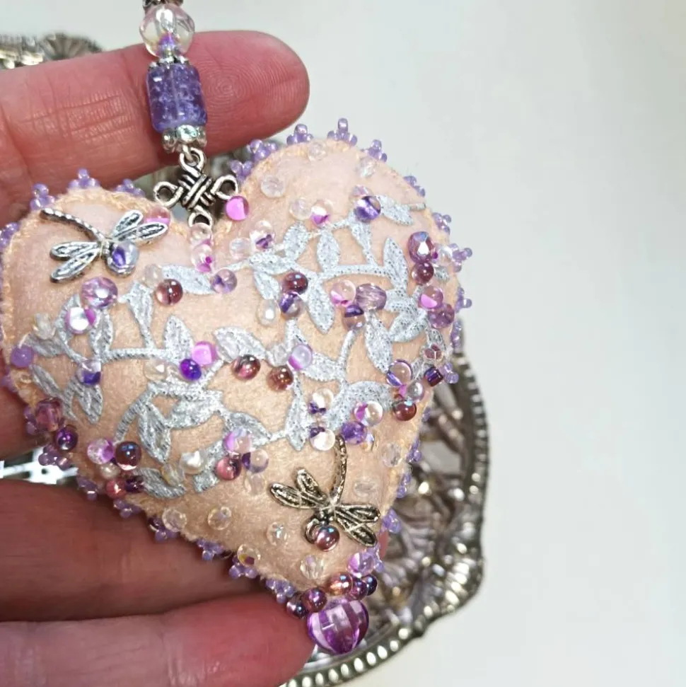 - Herz flieder lila violett: Mit Libelle auf Strasssteinchen, rosafarbenen Biwaperlen und Glastropfen auf Spitze auf der Rückseite, ca. 7,5 cm x 7,5 cm, 2 cm hoch, Gesamtlänge mit Kettchen 23 cm