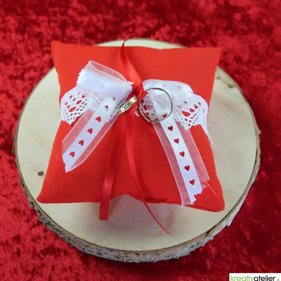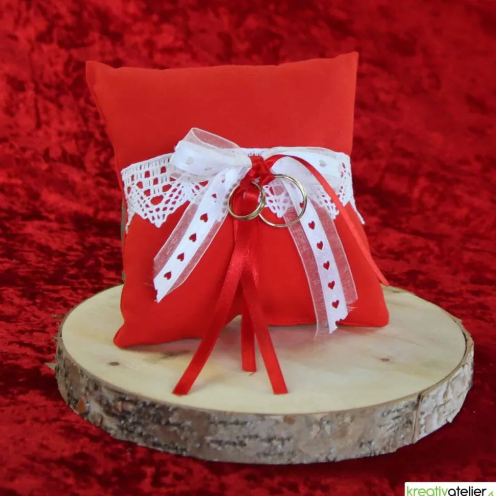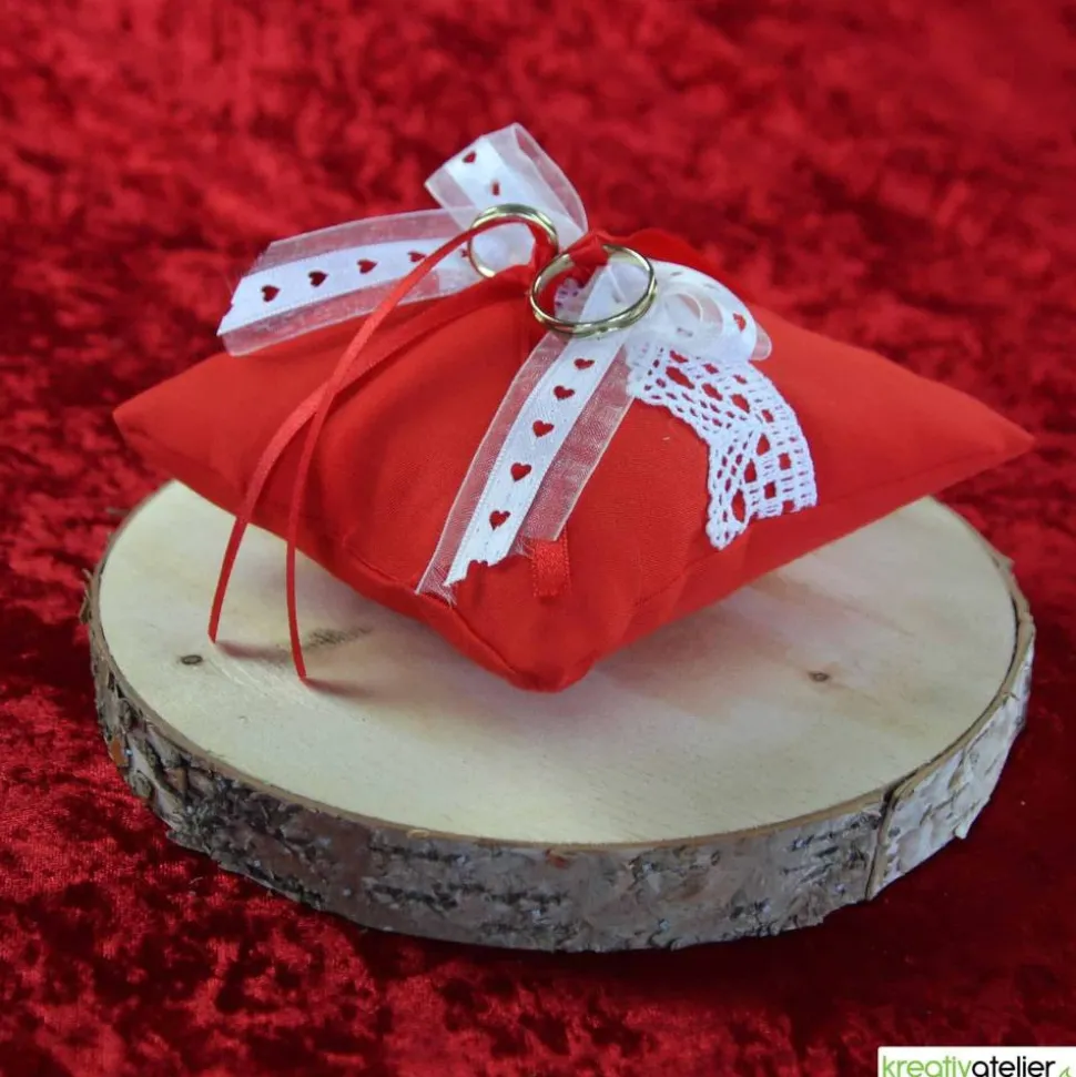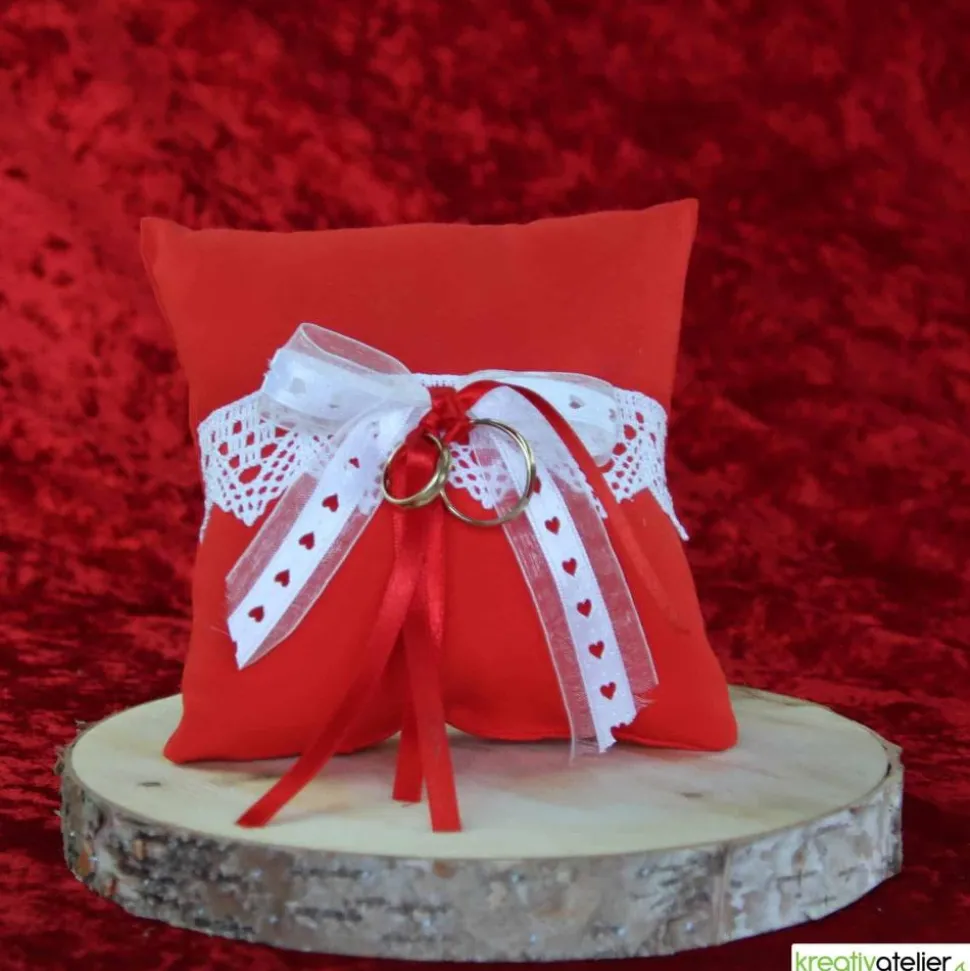 Entdecken Sie dieses handgearbeitete Ringkissen aus rotem Poppeline, das mit seiner Farbgebung und Gestaltung die Essenz wahrer Liebe symbolisiert – ideal für Ihre Hochzeit oder Verlobung. Rot, die Farbe der Leidenschaft und tiefen Liebe, verleiht diesem Kissen eine starke emotionale Aussagekraft und macht es zu einem echten Herzstück Ihrer Zeremonie.