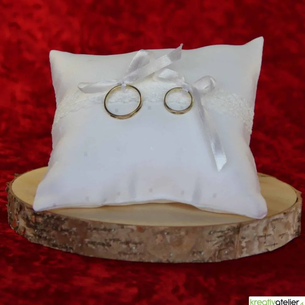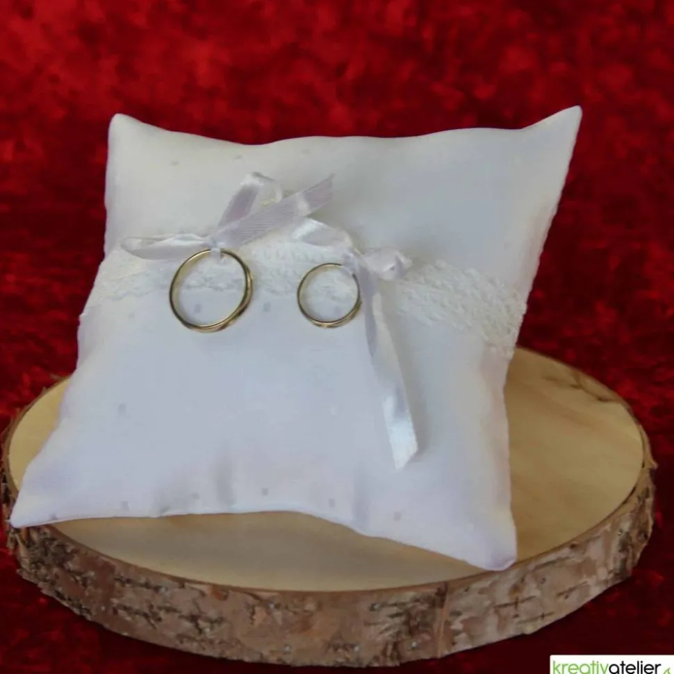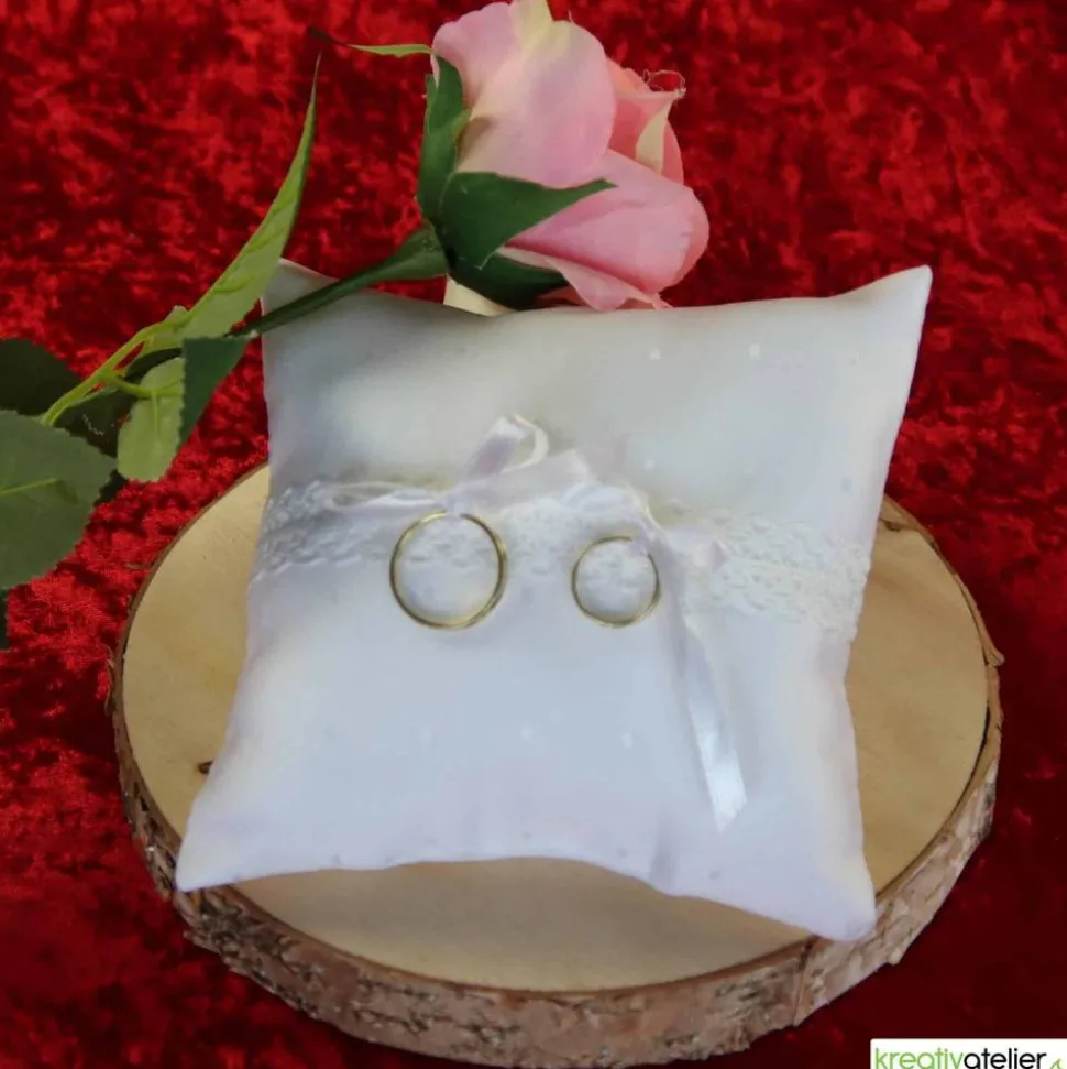Ein charakteristisches Merkmal dieses Kissens ist die etwa 2 cm breite Klöppelspitze, die sich in der Mitte des Kissens befindet. Diese Spitze verleiht dem ansonsten schlichten Design eine edle Note und unterstreicht die Bedeutung der darauf präsentierten Ringe. Sie ist nicht nur ein dekoratives Element, sondern symbolisiert auch die Feinheit und den Wert Ihrer Beziehung.