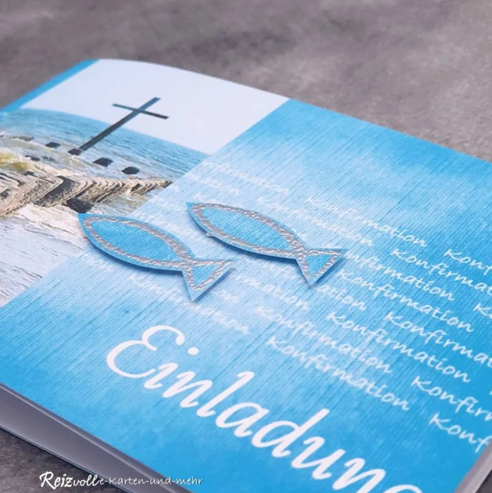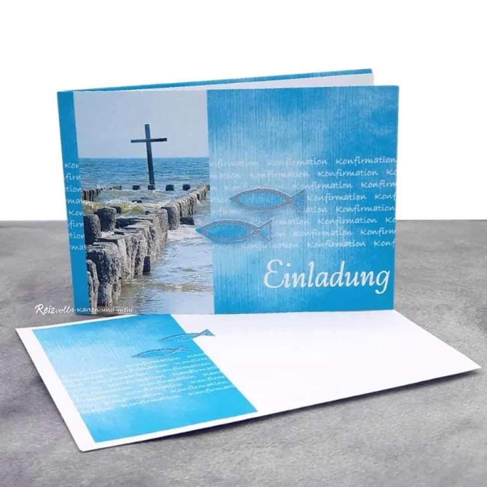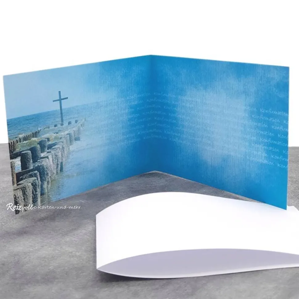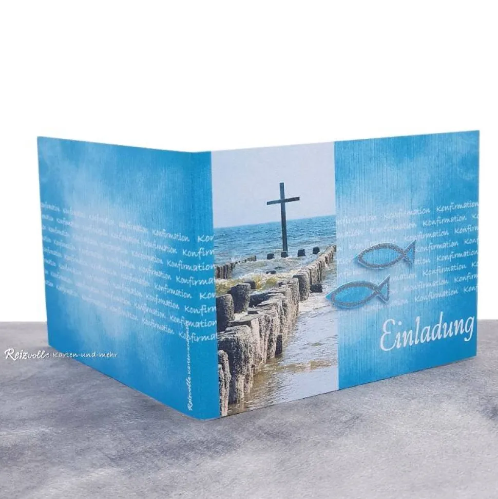 Gestalte deinen besonderen Tag mit einer einzigartigen Einladungskarte! Die Einladungskarte „Kreuz im Meer“ ist sowohl innen als auch außen liebevoll handgefertigt und eignet sich perfekt für Konfirmation, Kommunion oder Firmung. Der Schriftzug im Hintergrund wird nach deinem Wunsch angepasst, sodass die Karte individuell auf deinen Anlass abgestimmt ist.