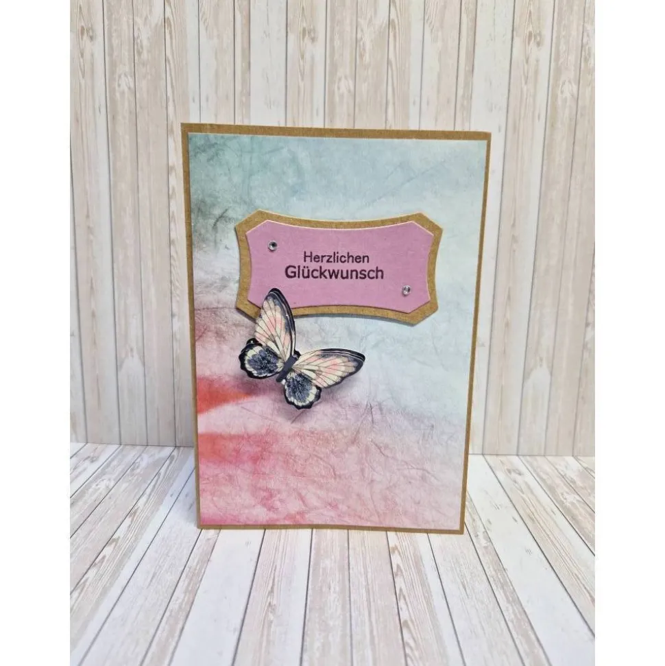 Der Aufleger ist mit detaillierten Stanzteilen, einem eleganten Schmetterling und zwei funkelnden Strasssteinchen verziert. Die Aufschrift „Herzlichen Glückwunsch“ macht diese Karte zum perfekten Begleiter für jeden besonderen Anlass.
