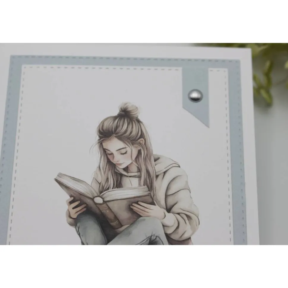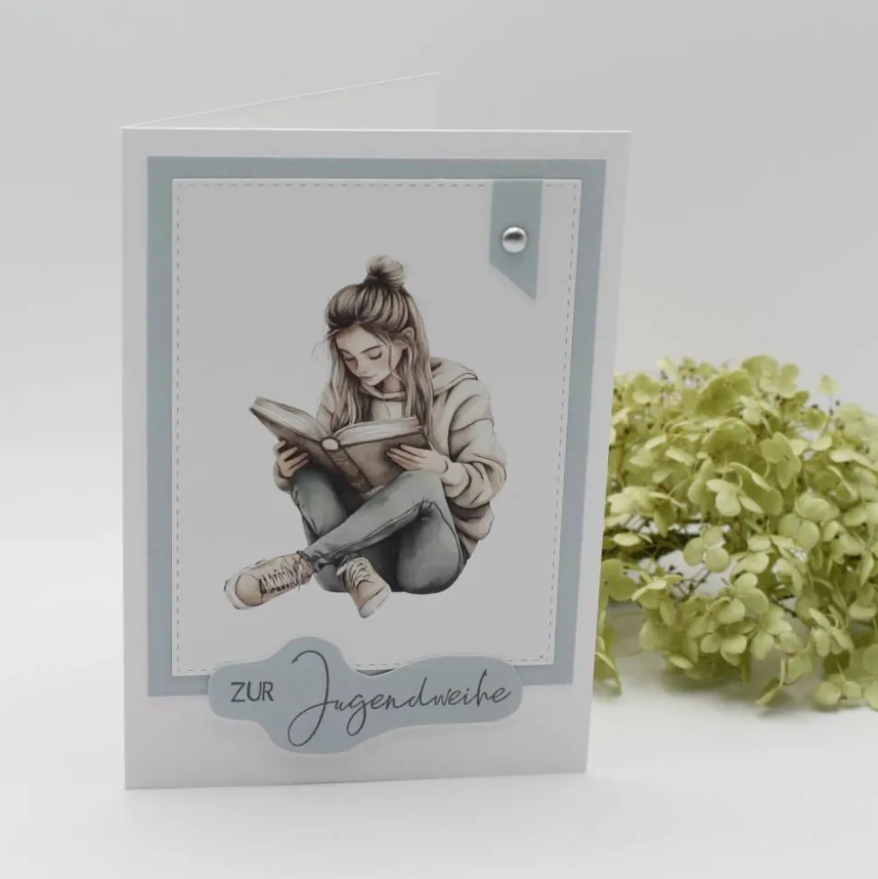 Im Mittelpunkt steht ein Mädchen im lässigen Outfit, vertieft in ihr Buch – ein modernes Symbol für deine Glückwünsche zum Start in einen neuen Lebensabschnitt.