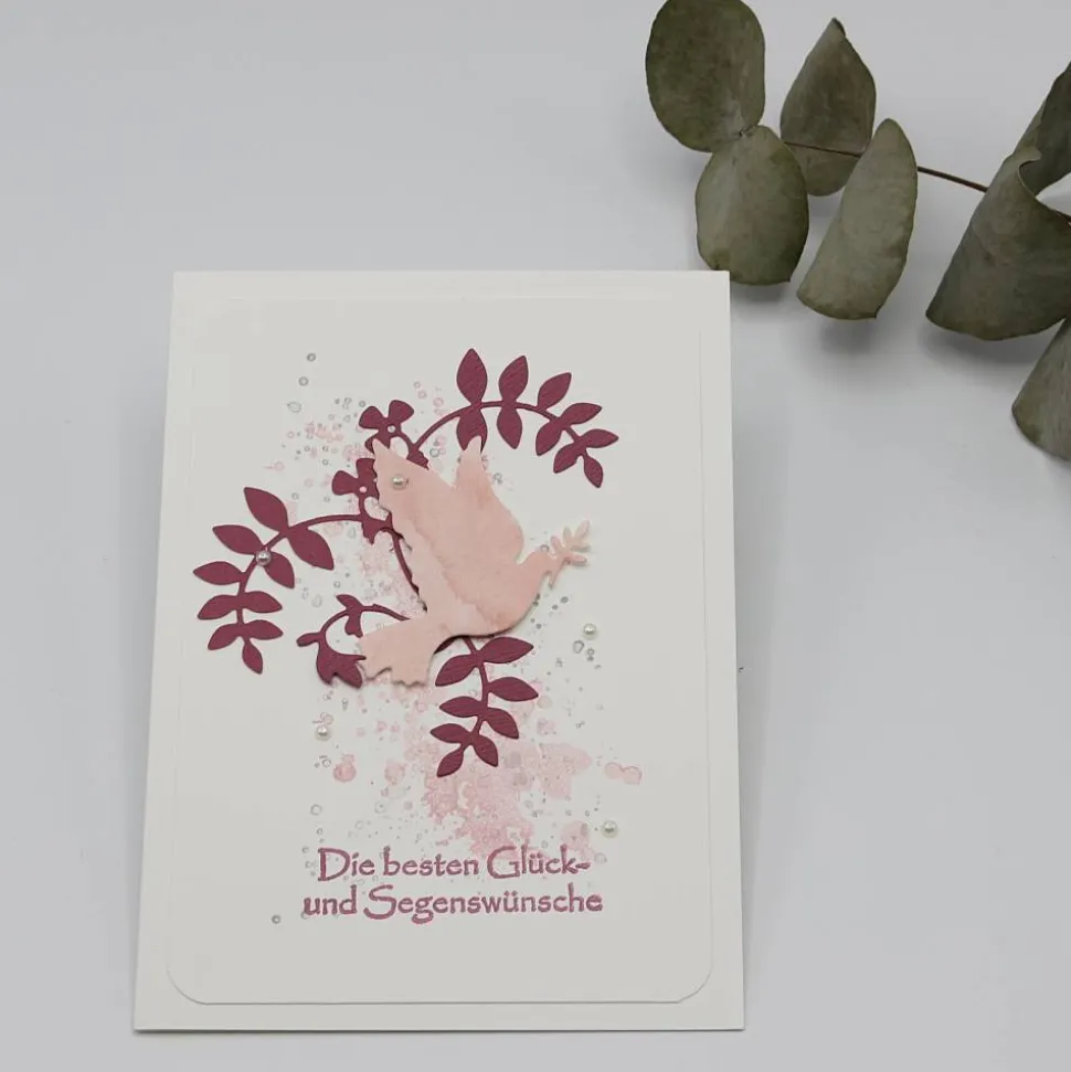 weißer sowie beerenfarbener Cardstock, selbst aquarelliertes Papier, Halbperlen aus Kunststoff