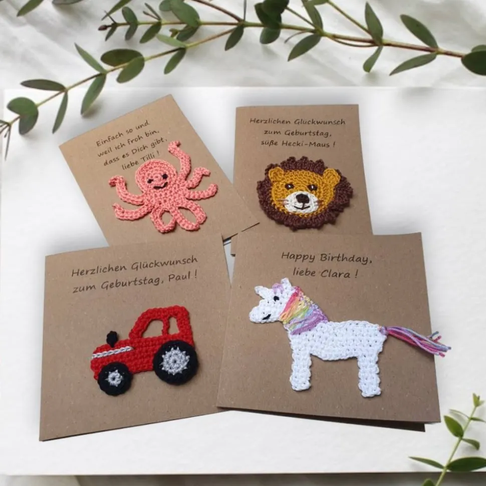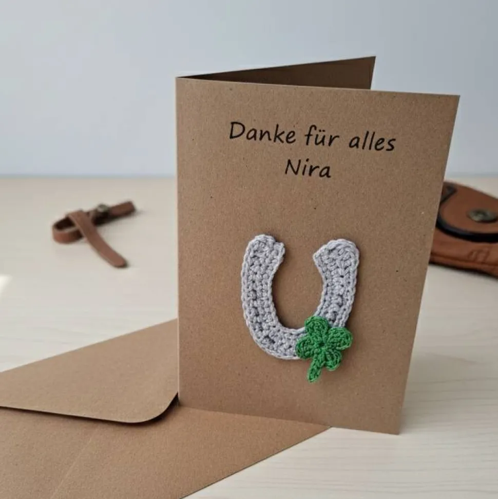 Diese liebevoll gestaltete Glückwunschkarte aus Kraftpapier ist mit einem gehäkelten Hufeisen und einem Kleeblatt verziert. Sie ist nicht nur ein Blickfang, sondern auch ein Glücksbringer, der zu jedem Anlass passt – als Geburtstagskarte für Pferdefreunde, Gutschein für Reitstunden oder als persönliche Grußkarte.