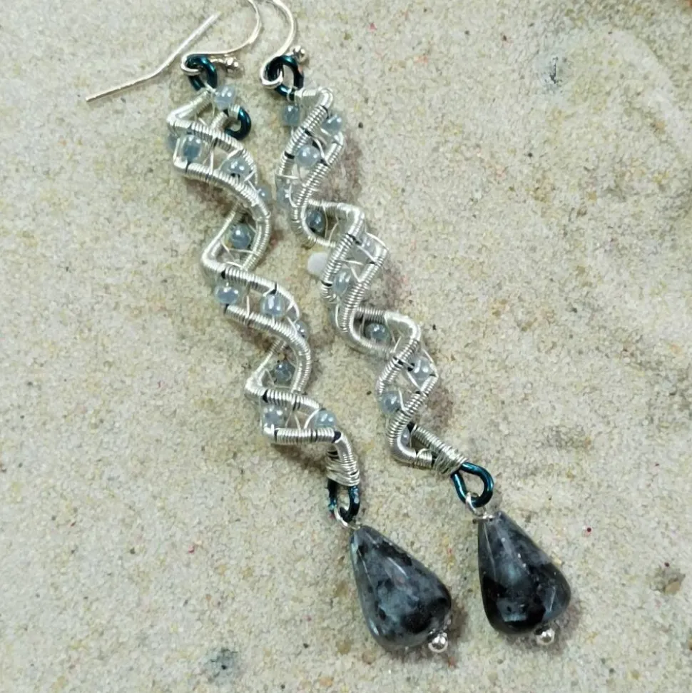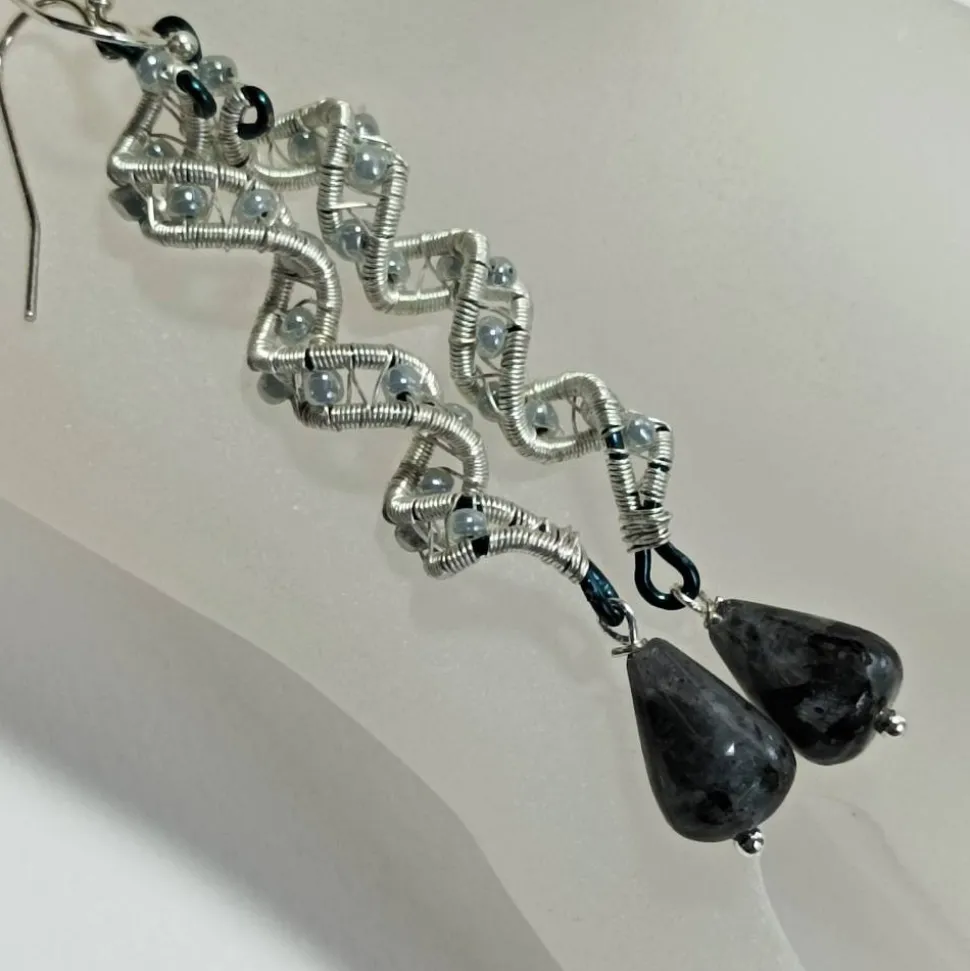 Entdecke traumhafte, handgemachte Labradorit Ohrringe in edlem Grau-Blau! Diese Ohrringe sind mit feinen Spiralperlen in wirework zweifarbig silberfarben auf blau metallic von Hand gewebt und mit kleinen schimmernden Glasperlen in Grau verziert. Der beweglich angehängte Tropfen aus isländischem Labradorit macht jedes Paar einzigartig.