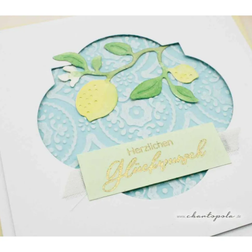 Die quadratische Klappkarte in elegantem Weiß wird durch ein mittig platziertes „Fenster“ im mediterranen Stil geprägt. Mal wirkt die Form rund, mal eckig – wie die geschwungenen Bögen südländischer Architektur. Dahinter leuchtet ein hellblau-weißes Kachelmuster in 3D-Optik, das sofort Assoziationen an Urlaub, Meer und warme Sommertage weckt. Über dem Fenster rankt ein liebevoll aaquarellierter Zitronenzweig. Zitronen stehen seit jeher für Frische, Hoffnung und die sonnige Leichtigkeit des Südens – ein Symbol, das Lebensfreude versprüht.