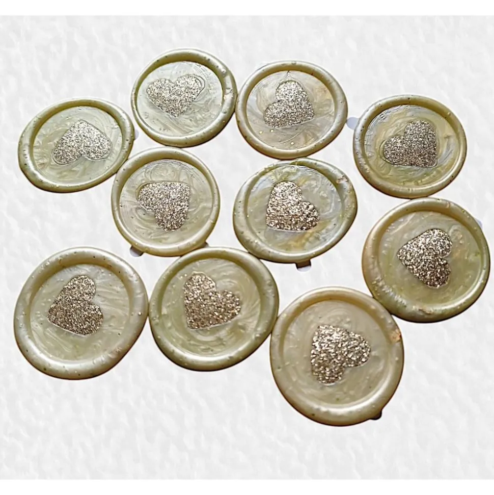 Du erhältst 10 selbstklebende Wachssiegel mit goldenen Herzen, die durch ihre perlmutt weiße, goldene, irisierende und transparente Wachsfarbe sowie feine Metallflocken und Glitzer in Gold bestechen. Die Herzen sind aus goldenem Glitzerkarton gestanzt und direkt in das Siegel eingegossen – jedes Siegel ist ein echtes Unikat!
