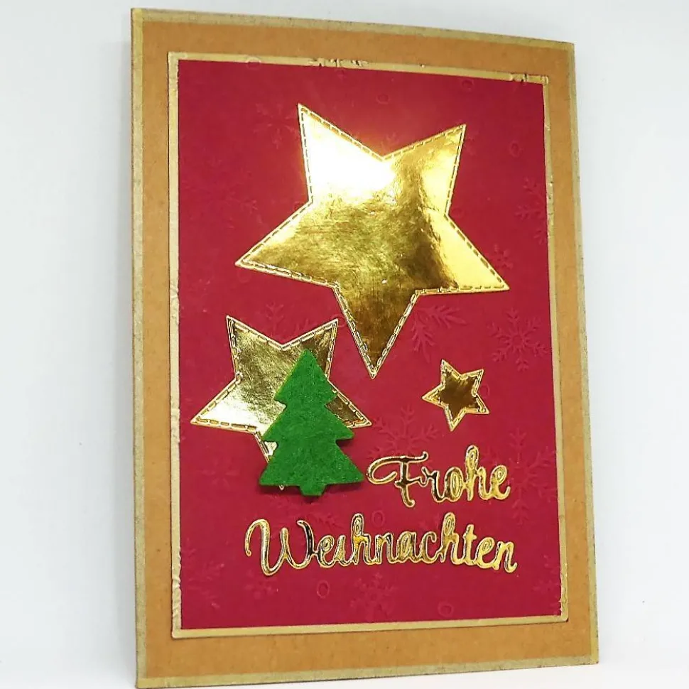 Diese liebevoll gestaltete Faltkarte aus naturbraunem Kraftpapier ist ein echtes Unikat und ein besonderer Blickfang. Die Vorderseite ziert ein edler, dunkelroter Hintergrund aus geprägtem Tonpapier mit Schneekristallen, darauf handgefertigte, ausgestanzte goldene Sterne und ein Tannenbaum aus grünem Filz als Highlight. Die Karte ist mit „Frohe Weihnachten“ in goldfarbenen Buchstaben beschriftet und elegant goldfarben umrandet.