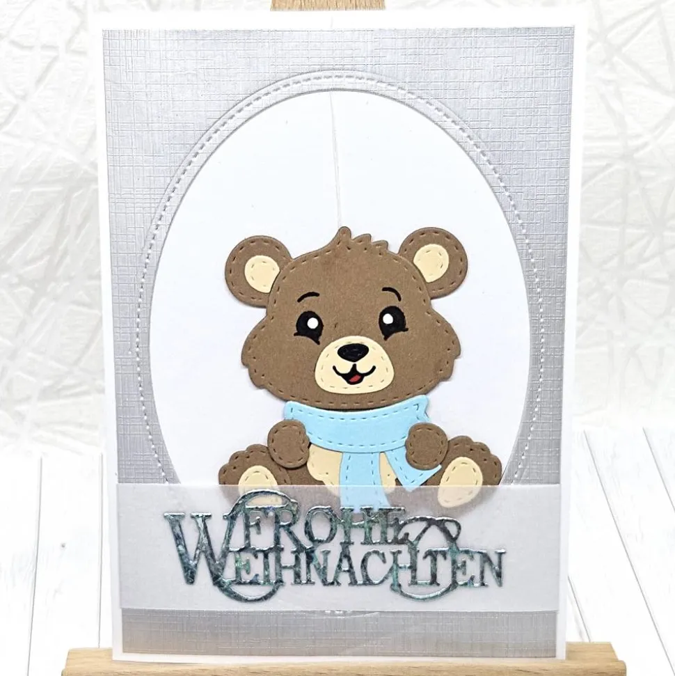 Versende besondere Weihnachtsgrüße mit dieser einzigartigen, handgefertigten Weihnachtskarte mit Bär und hellblauem Schal. Der niedliche Bär auf einem silberfarben schimmernden Hintergrund bringt winterliche Stimmung und ist ein echter Hingucker.