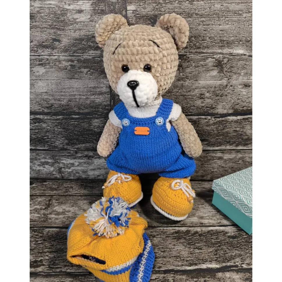 Er trägt einen blauen Overall, ein weiches weißes Jäckchen, eine fröhliche orange-blaue Mütze und passende Schuhe – alle Kleidungsstücke lassen sich ausziehen und wieder anziehen, was zusätzlich zum Spielen einlädt. Weicher, gehäkelter Teddybär – ideal als Geschenk zur Geburt oder Taufe. Handgemacht, hypoallergen & mit süßer, abnehmbarer Kleidung. Teddybär mit abziehbarer Kleidung – fördert spielerisch Feinmotorik.