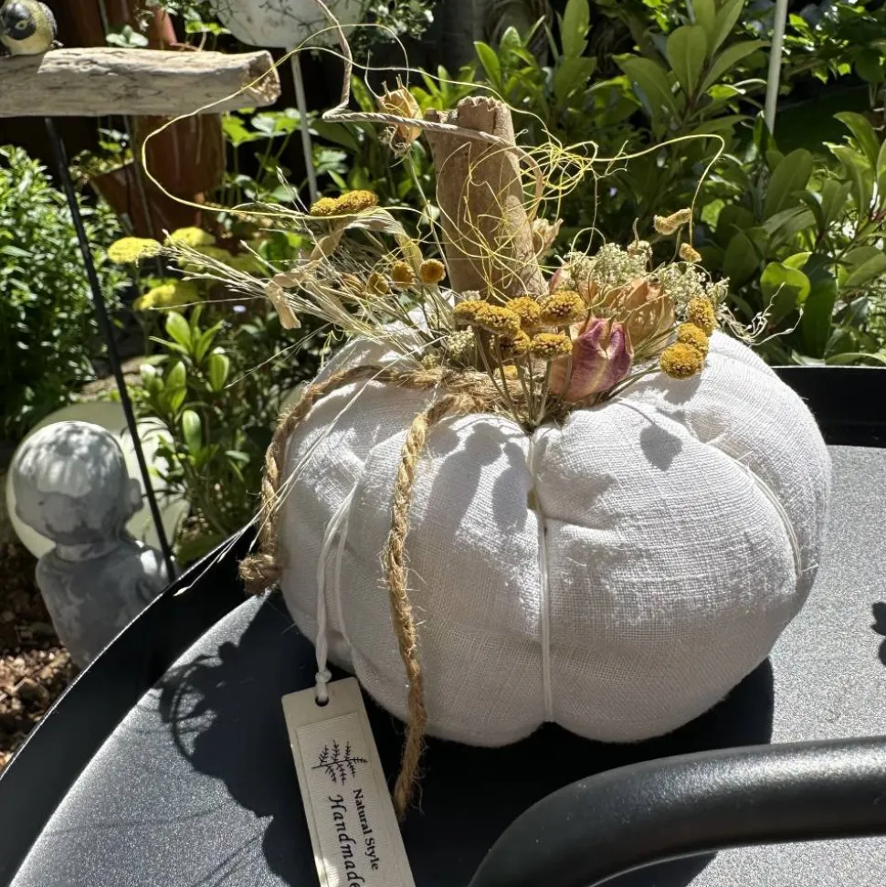 Maße: Durchmesser Ø18cm, Höhe mit Holzstiel ca. 17 cm, Umfang 47cm. Der Kürbis ist aus 100% antikem, feingewebtem Leinen gefertigt und mit Flockenwatte gefüllt. Eine Birkenholzscheibe an der Unterseite sorgt für einen stabilen Stand.