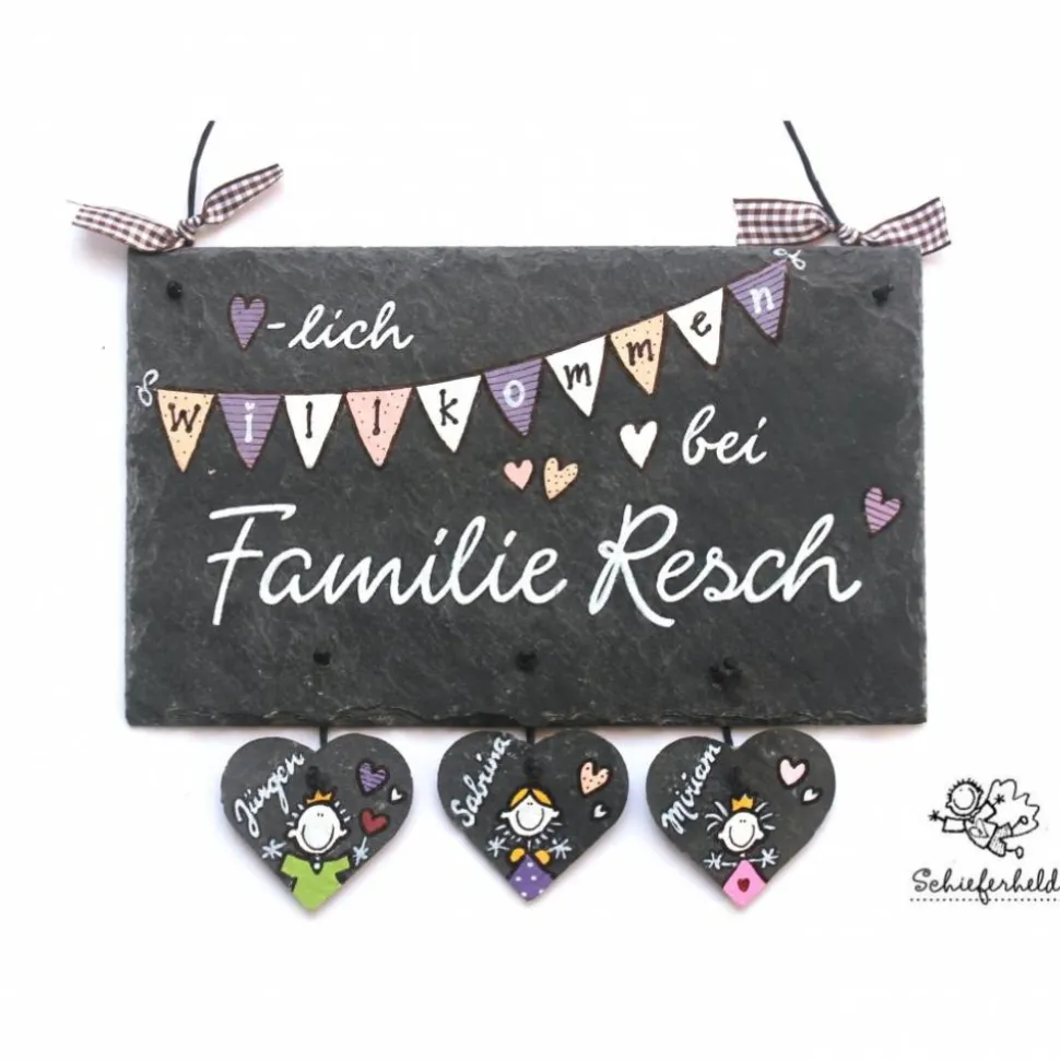 Entdecke ein exklusives Haustürschild aus Schiefer, das individuell für dich personalisiert wird! Dieses hochwertige Familienschild ist ein echtes Unikat und wird liebevoll aus Naturschiefer handgefertigt – wetterfest, langlebig und mit viel Liebe zum Detail bemalt. Ob als Willkommensschild für deinen Hauseingang, als Türdeko oder Wanddeko – mit seinem edlen Design und der natürlichen Optik wertet das Schieferschild jeden Eingangsbereich auf.