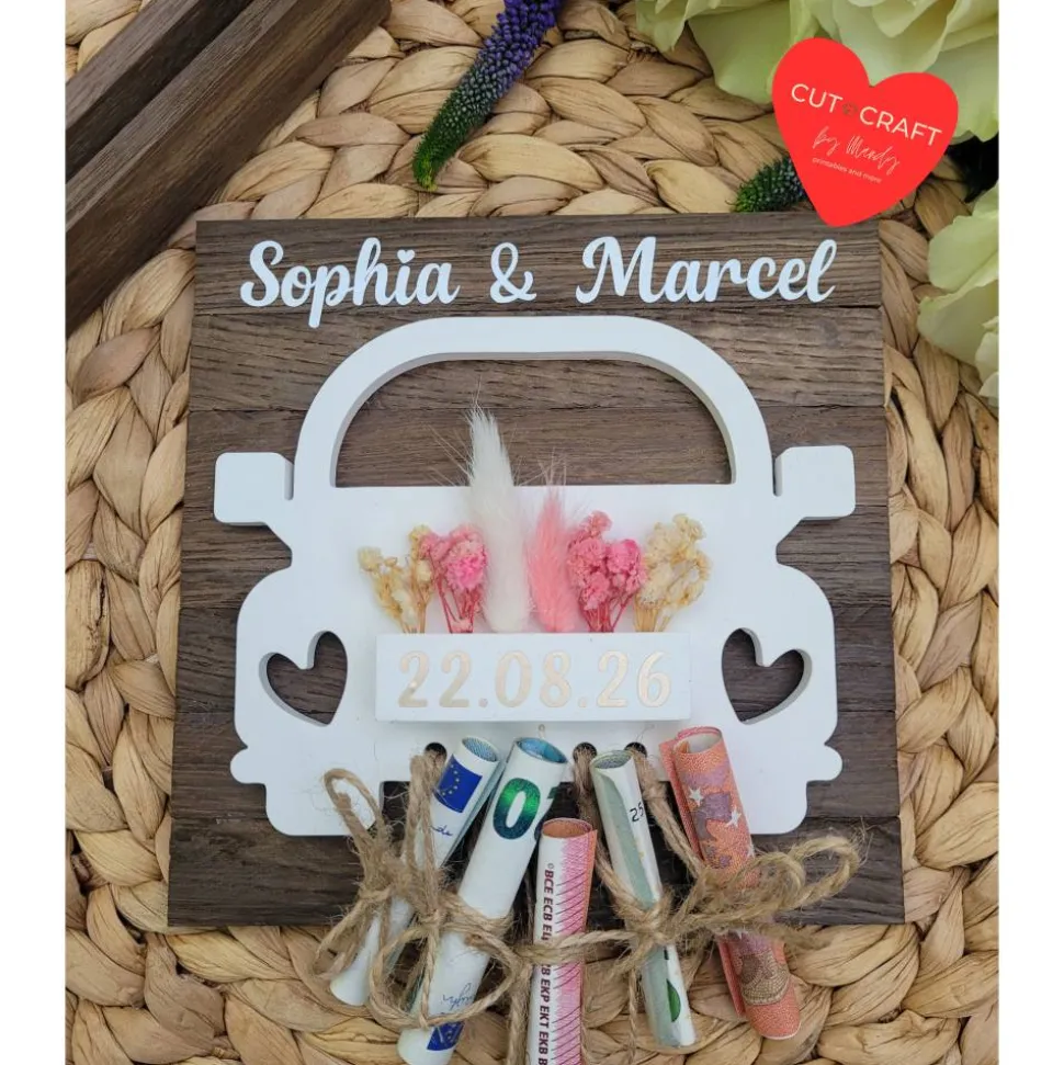 Das Hochzeitsauto, handgegossen aus Keracraft, mit Holzhintergrund mit zarten Trockenblumen, sowie euren Wunschdaten veredelt – ein dekoratives Highlight, das jedes Brautpaar begeistert.