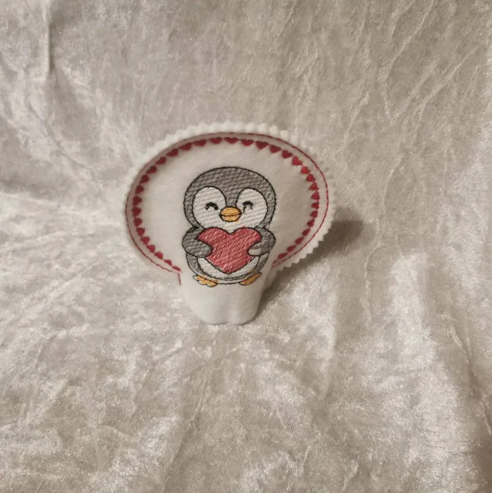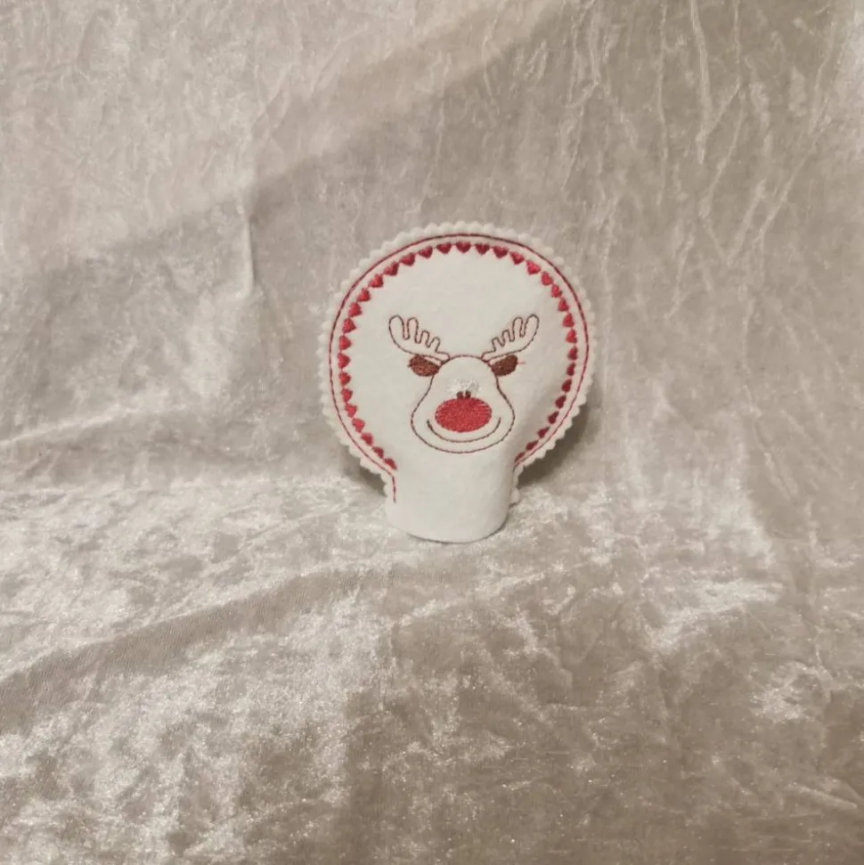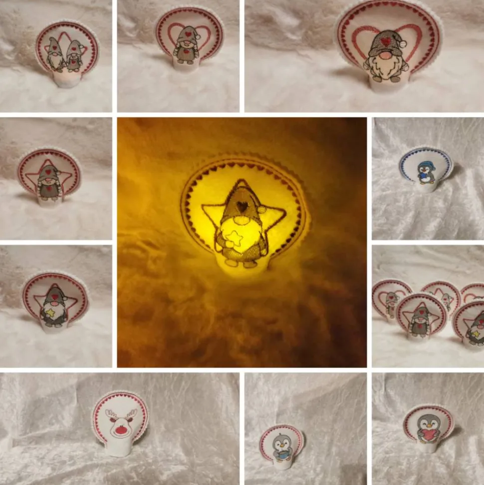 Jedes Teelichtcover wird mit viel Liebe aus weißem Filz (1 mm stark) gefertigt und aufwendig bestickt – wahlweise mit einem süßen Wichtel, einem fröhlichen Pinguin oder einem niedlichen Rentier.