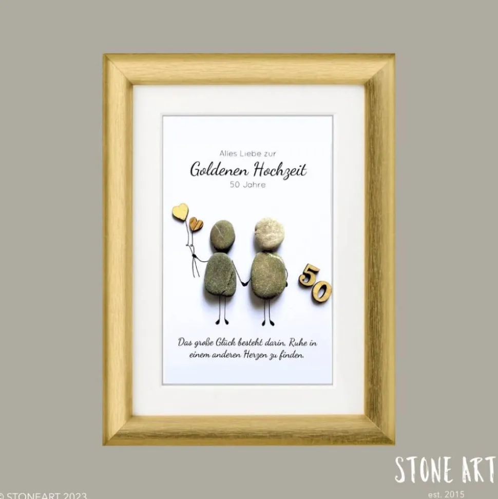 eiere die Goldene Hochzeit – 50 Jahre gemeinsame Liebe – mit einem handgefertigten Steinbild als Geschenk. Jedes Bild wird aus natürlichen Kieselsteinchen sorgfältig gestaltet und ist ein einzigartiges Unikat, das die Liebe, Verbundenheit und gemeinsamen Jahre eines Paares symbolisiert.