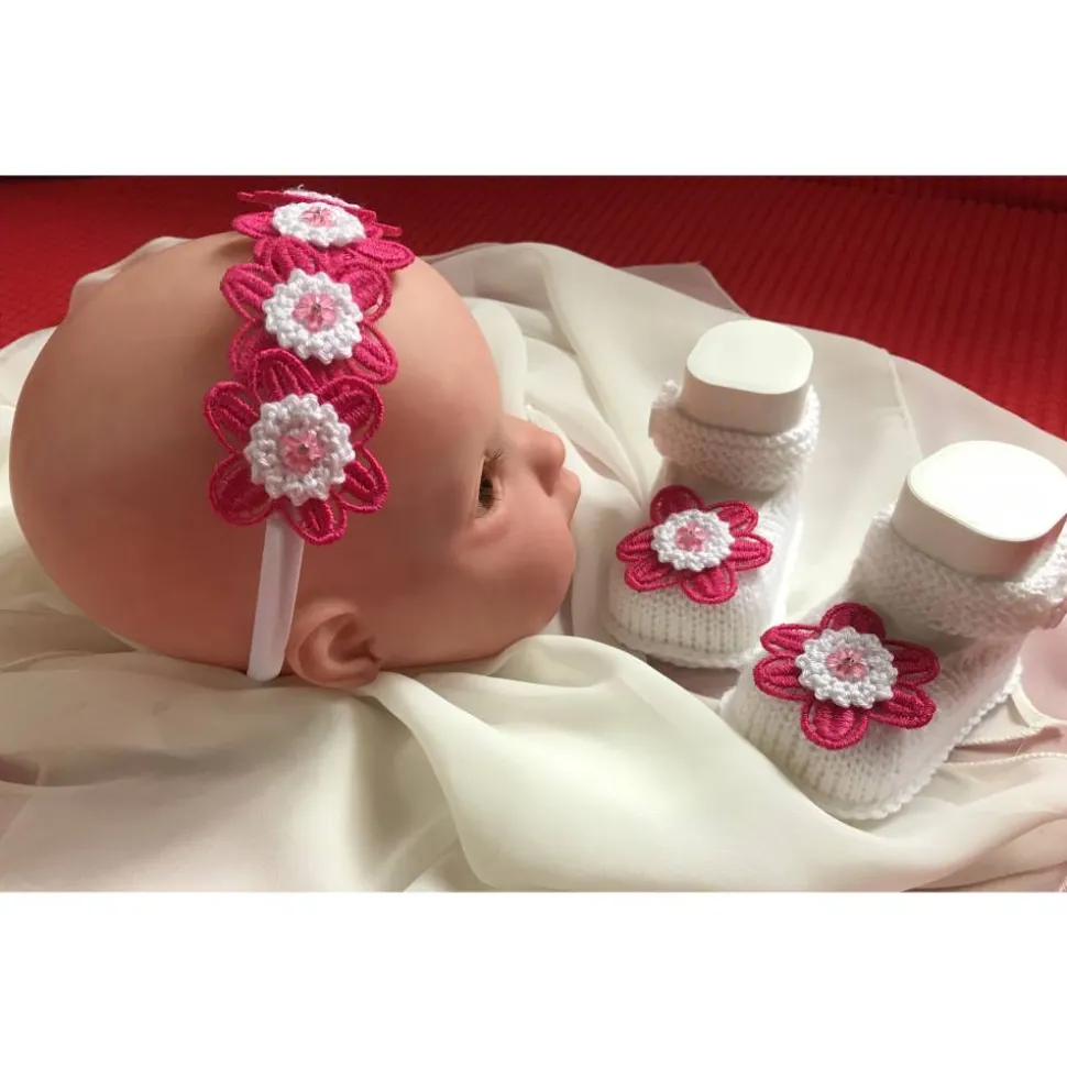Entdecke das handgefertigte Set Taufe Mira – bestehend aus einem liebevoll gestalteten Haarreif und süßen Babyschühchen mit aufwändig gearbeiteten Blüten und Perlen. Perfekt für große Auftritte wie Taufe, Hochzeit oder Geburtstag. Auch als Geschenk zur Babyparty oder zum Junggesellinnenabschied ein Highlight!