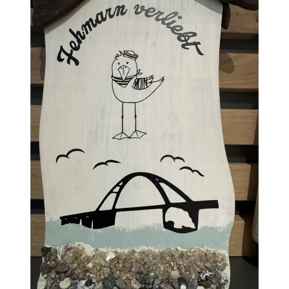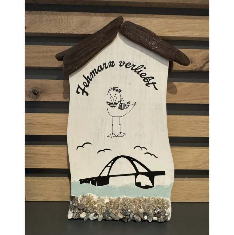 Die natürliche Maserung und die individuellen Unebenheiten des Holzes verleihen jedem Häuschen seinen besonderen Charakter. Das detailreiche Design vereint die maritime Schönheit der Fehmarn Brücke, eine charmante Möwe mit „Moin“-Gruß und das farbenfrohe Meer mit dem Schriftzug „Fehmarn verliebt“.