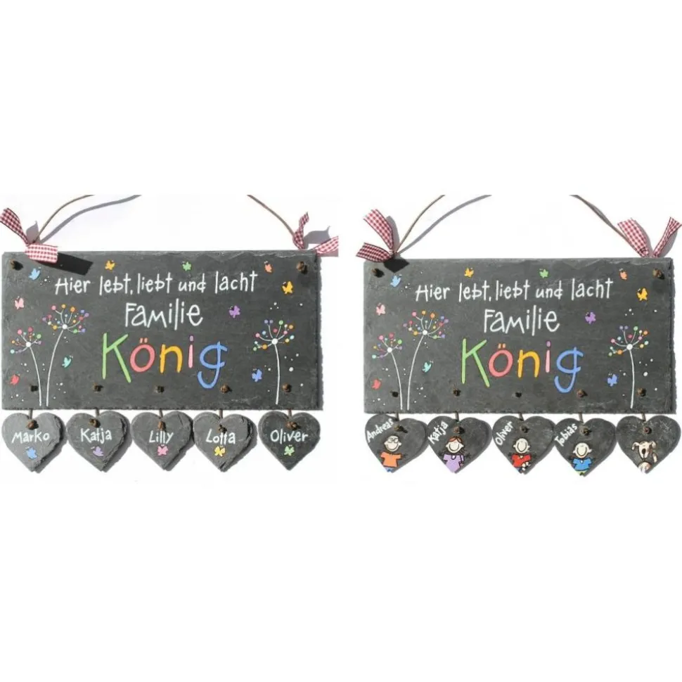 - 3 bis 6 Schiefer-Herzanhänger (je nach Familiengröße), beschriftet mit Vornamen, Schmetterling oder Figur nach Wahl