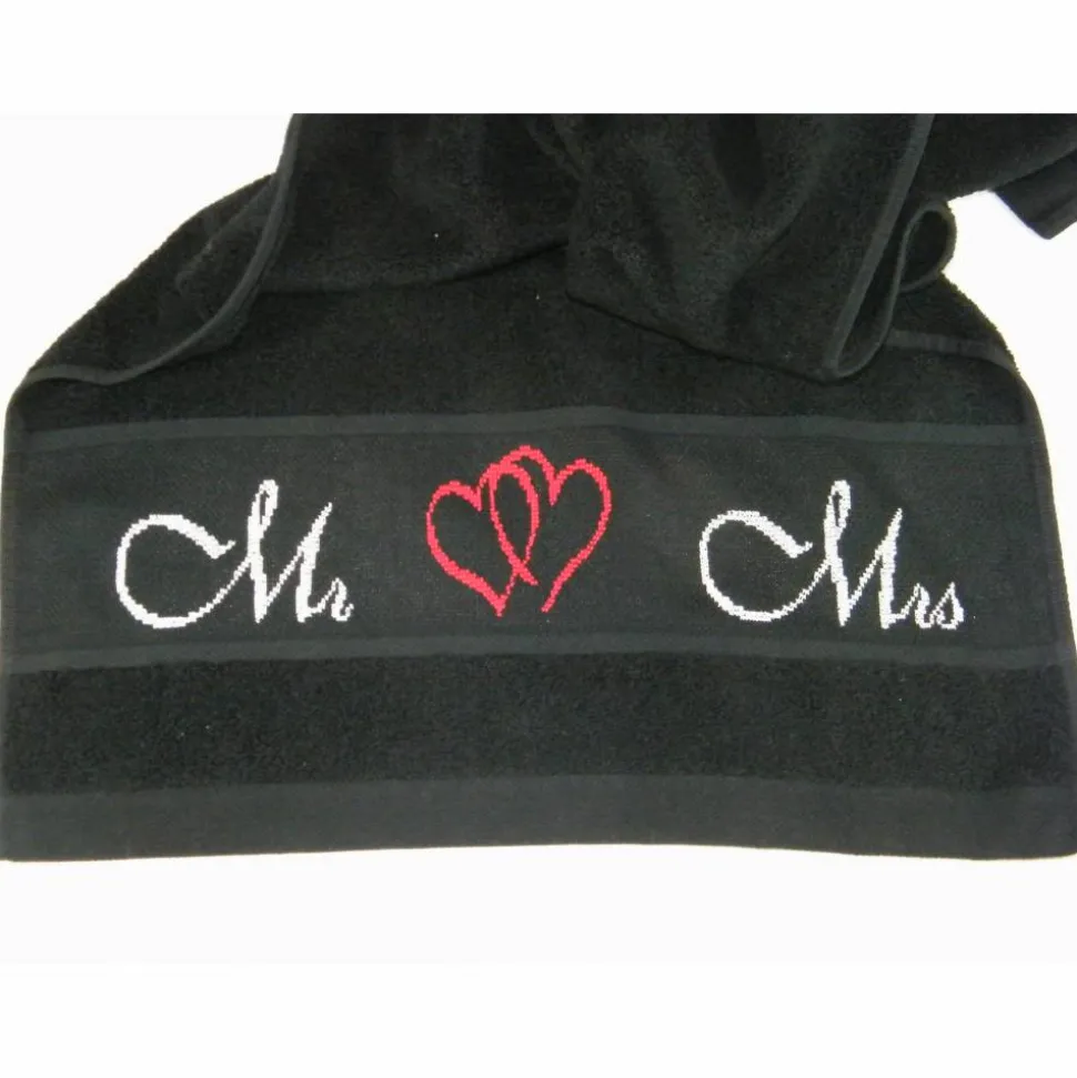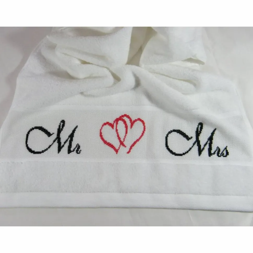 Lieferumfang: Sie erhalten 1 Handtuchtuch, 50 x 100 cm, handbestickt mit dem Schriftzug „Mr“ und „Mrs“ verbunden durch 2 Herzen in rot