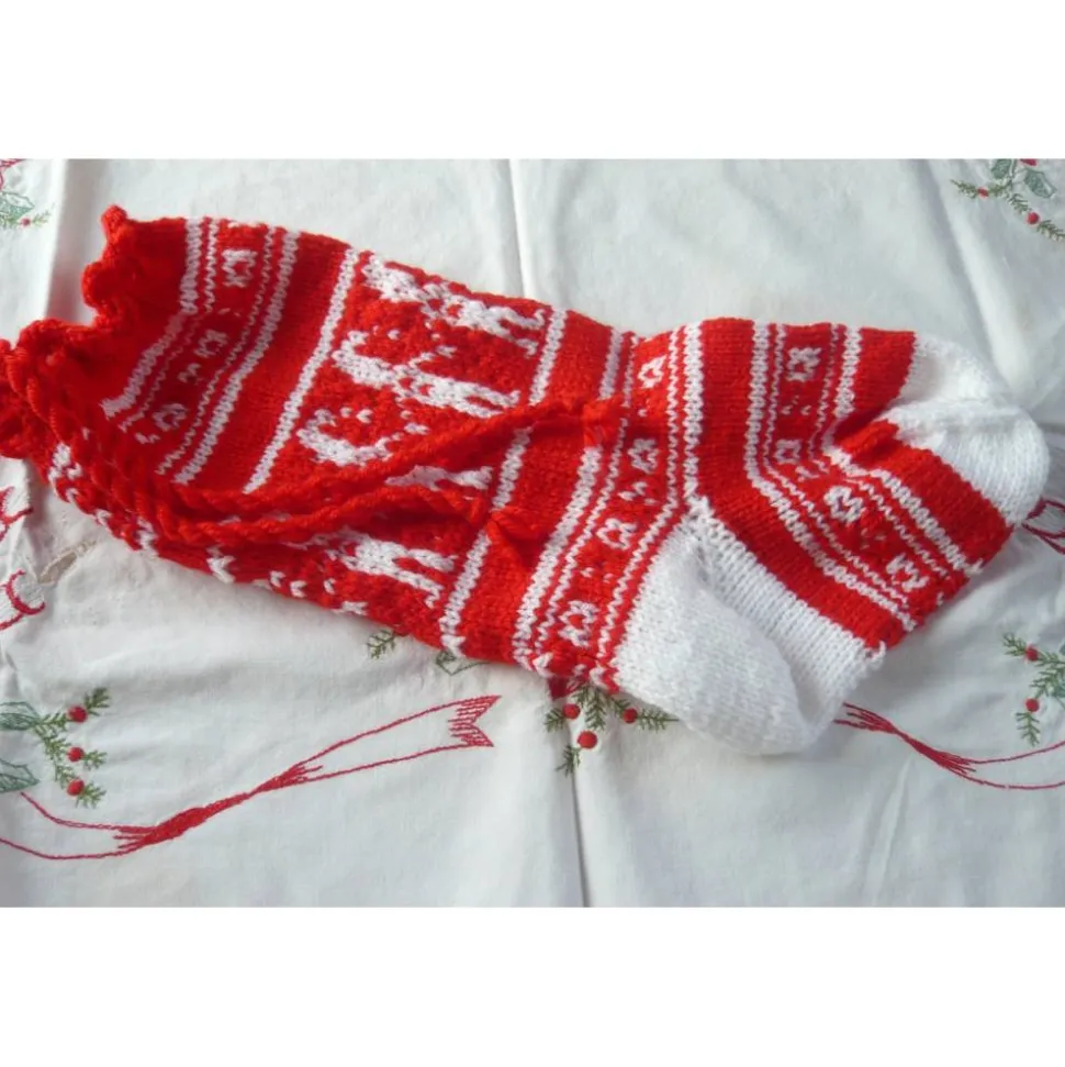 Ich habe den rot weißen Nikolausstiefel handgestrickt mit weihnachtlichen Motiven.