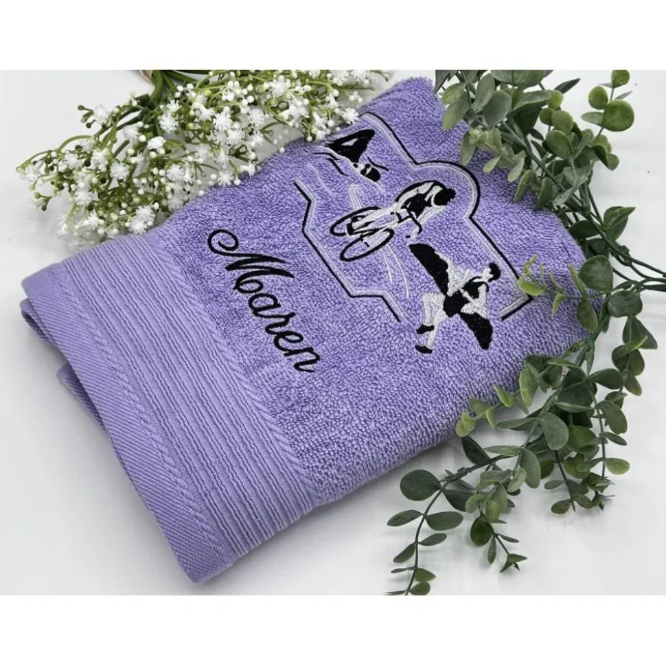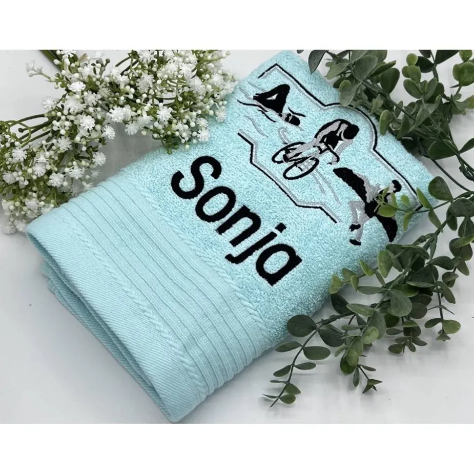 Du kannst dir eine aus 18 Handtuchfarben aussuchen und entscheidest dich für eine von 4 Schriftarten.