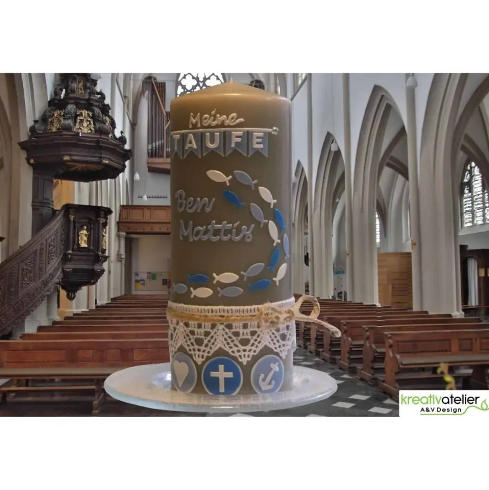 Aufwändig und liebevoll von Hand gestaltete Taufkerze in taupe. Der Name des Täuflings wird von einem Schwarm kleiner Fische aus verschiedenen Blautönen und weiß eingerahmt. Die untere Verzierung besteht aus einer echten Klöppelspitze, die rund um die Kerze verläuft und von einer Jutekordel gehalten wird, die zu einer Schleife gebunden ist. Das von Hand aus verschiedenen Wachsplatten ausgeschnittene „Glaube, Liebe, Hoffnung“ am unteren Rand der Kerze ist aufwändig mit mehreren Wachslagen gestaltet. Der Schriftzug „Meine Taufe“ besteht aus echten Wachsbuchstaben und hebt sich von der Kerze ab.