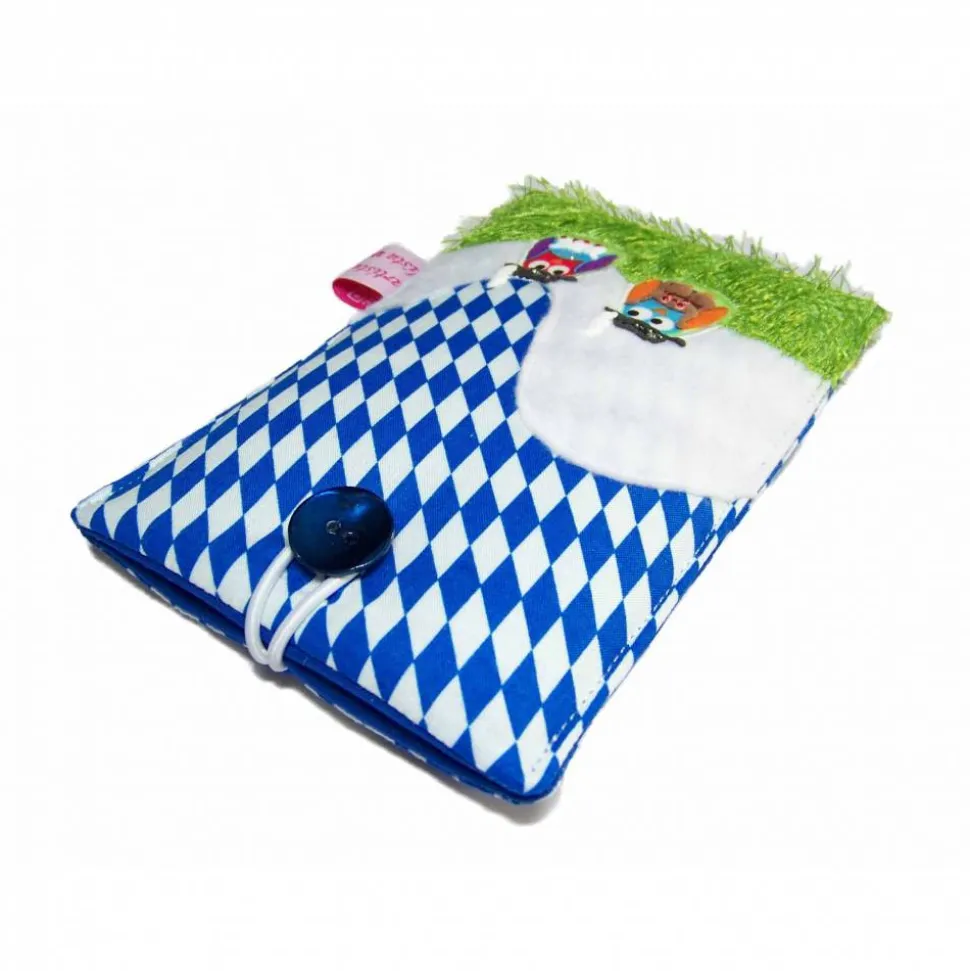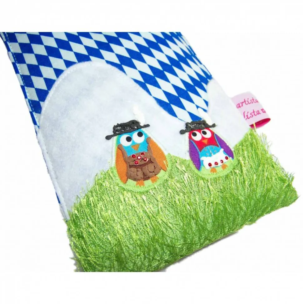 Diese schicke und handgemachte Handyhülle „Meine Heimat Holldriö“ ist aus Baumwolle und mit Vlies verstärkt. Innen ist sie passend mit Baumwollstoff gefüttert. Die bayerische Landschaft ist aus Filz und Grasstoff gefertigt. Auf der Handyhülle siehst du zwei Eulchen (können farblich variieren), denen ich aufwändig mit Textilfarbe/Glitzer und Strasssteinchen eine Tracht verpasst habe 😉