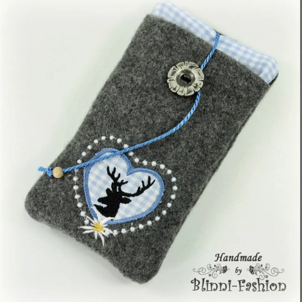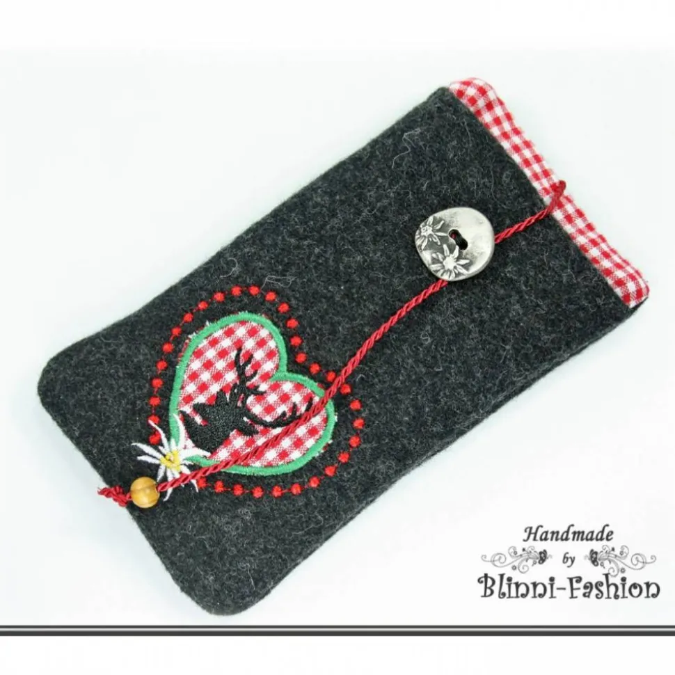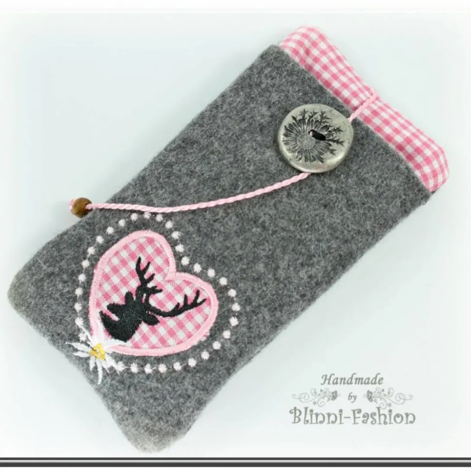 Genäht aus kuscheligem, meliertem Kashmir/Wollstoff und einem kariertem Baumwollstoff. Aufgepeppt mit einer schönen Herz-Hirsch-Applikation und einem urigen Trachtenknopf ist sie genau das Richtige für alle Dirndl-, Trachten- und Oktoberfestfans.
