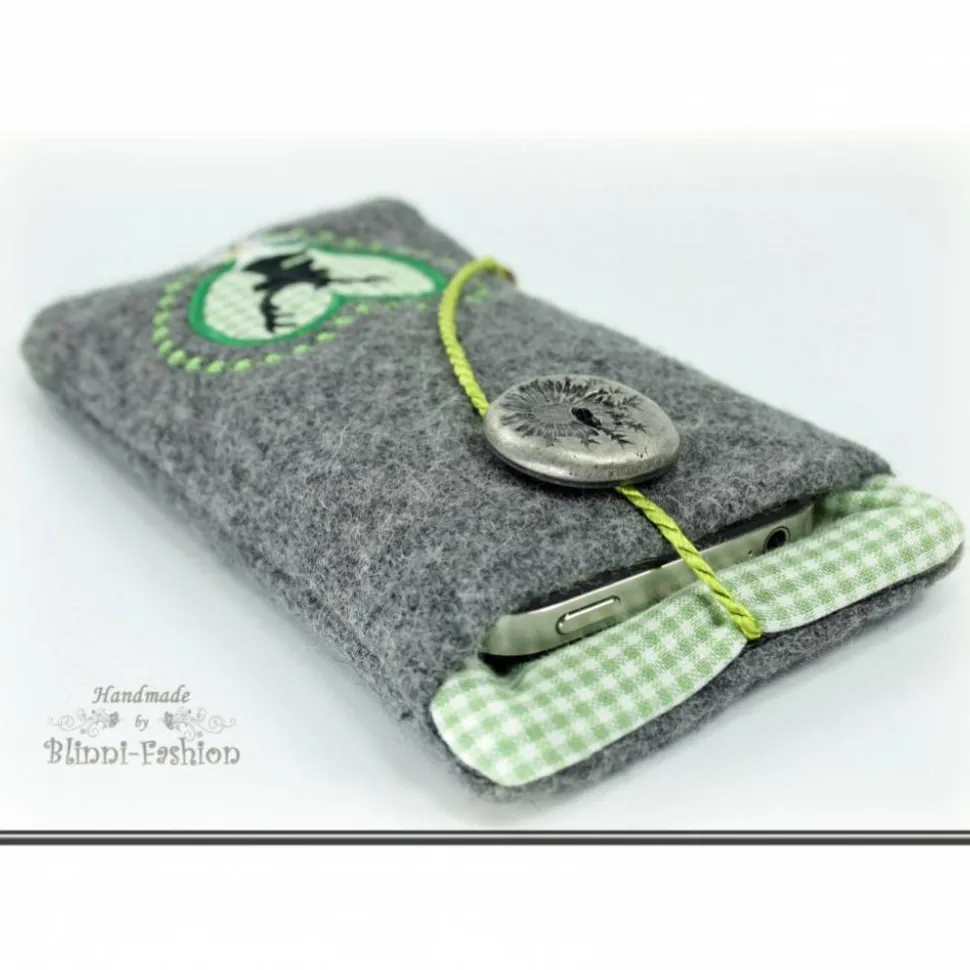 Die Handytasche wird mit Knopf und Kordel geschlossen. Innen ist sie komplett gefüttert und mit einer leichten Wattierung gepolstert.