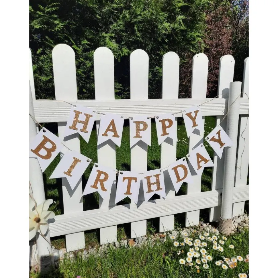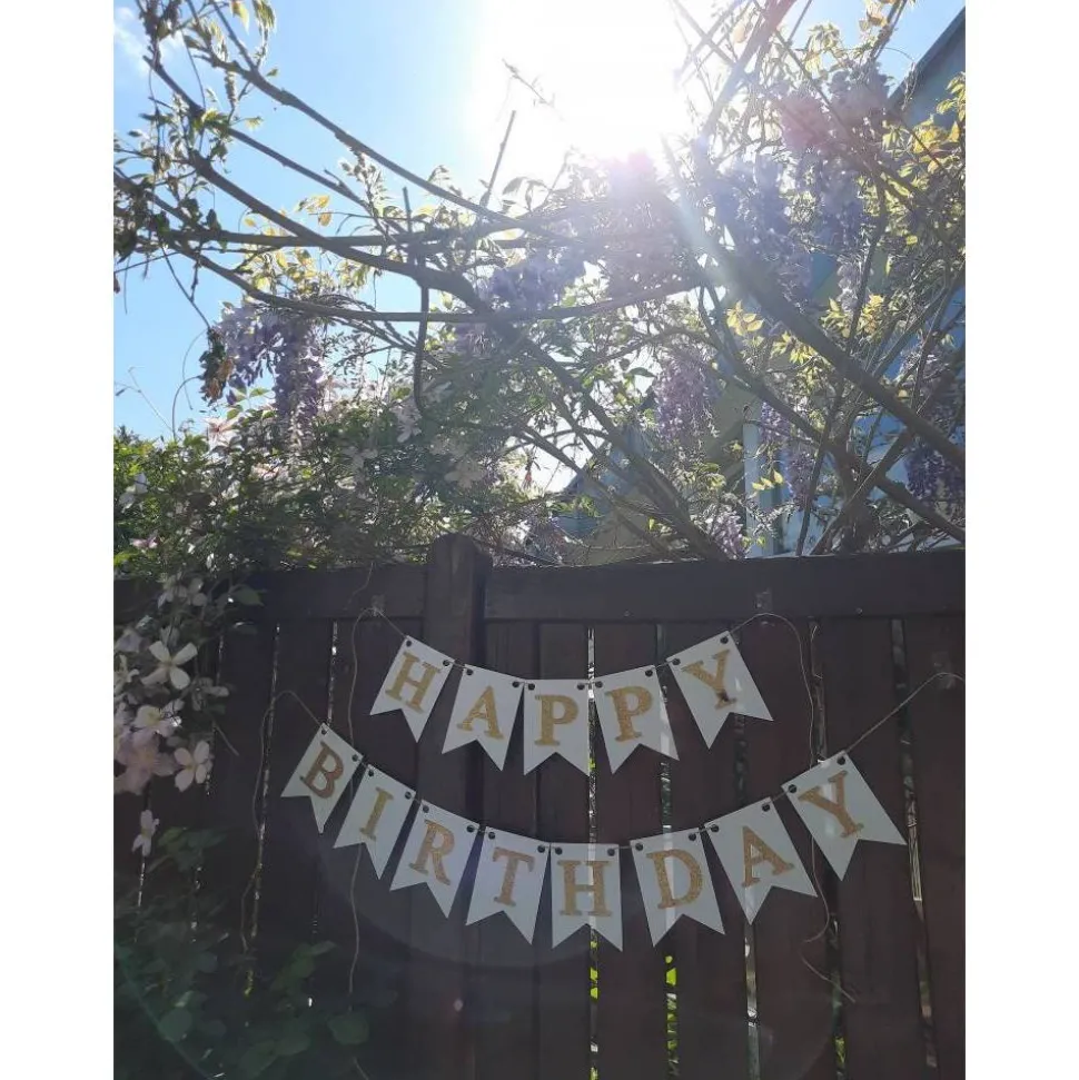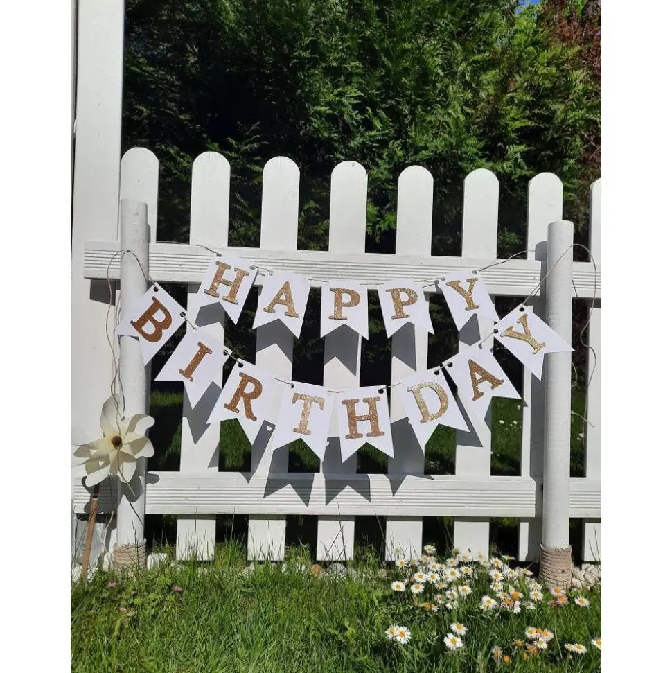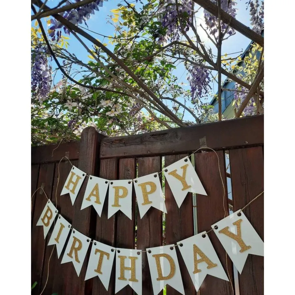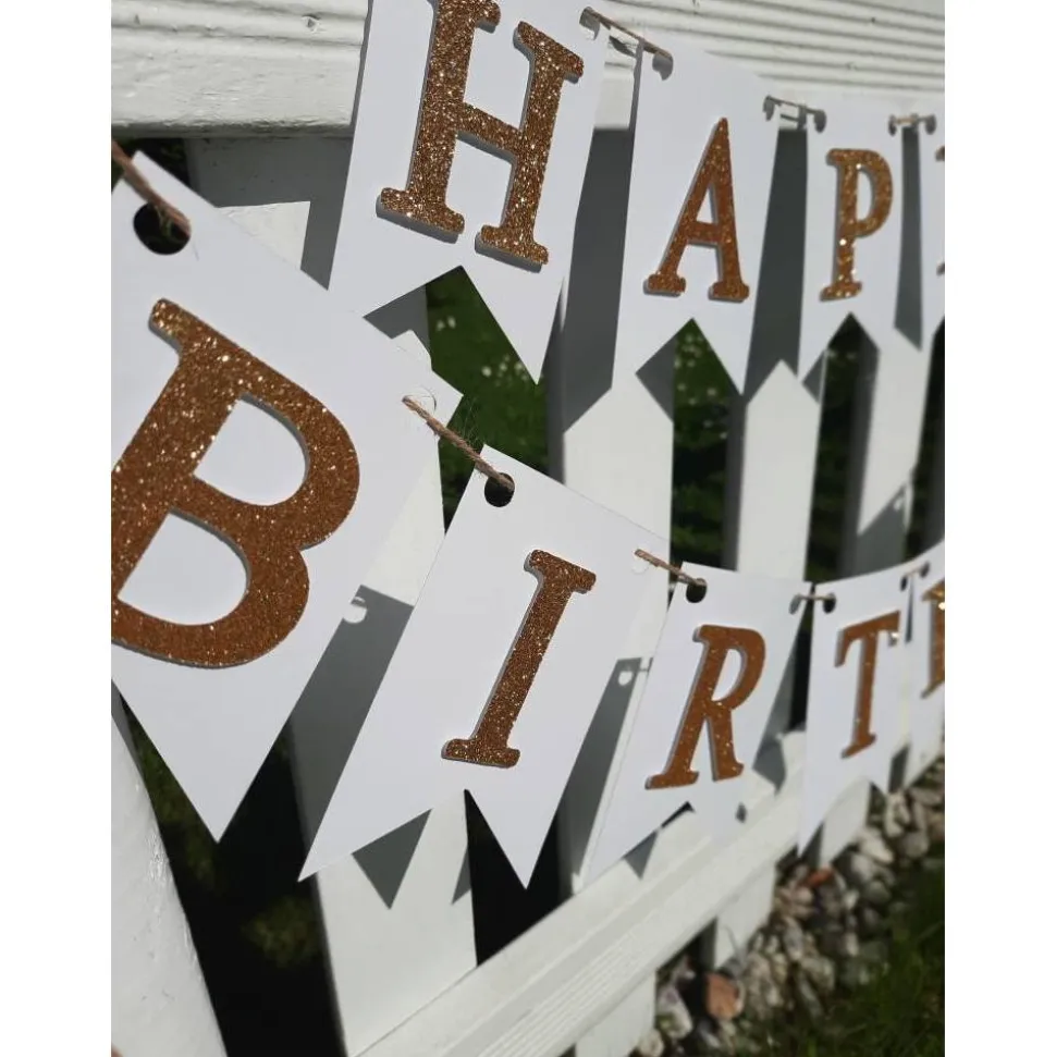 Ganz schlicht und elegant funkeln die goldenen Buchstaben auf den weißen Wimpeln.