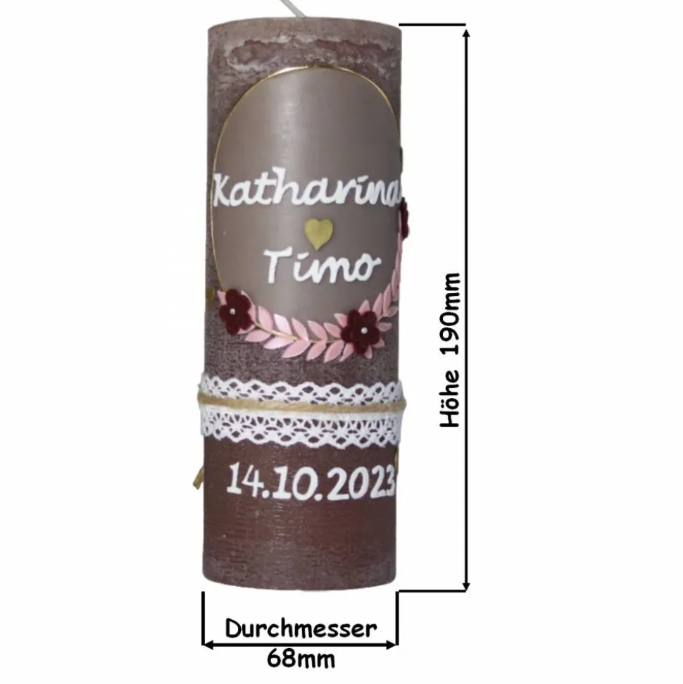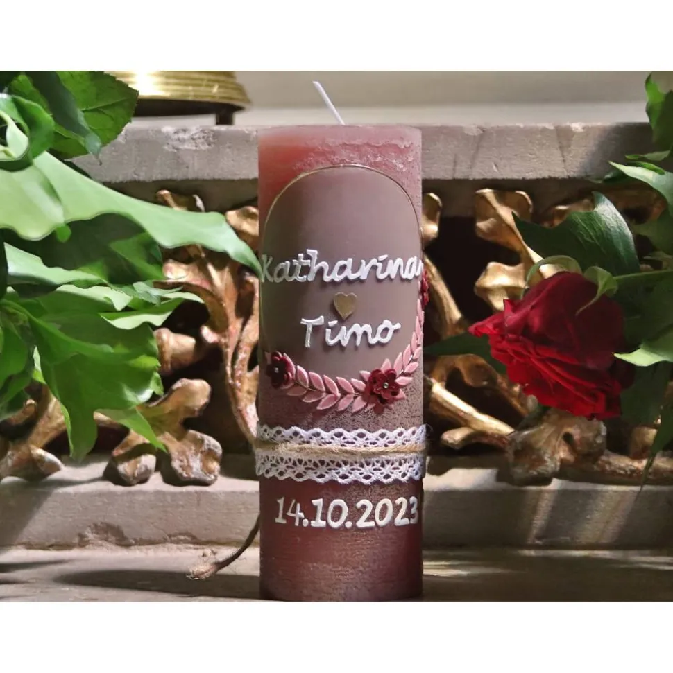 Mit den Namen des Paares und dem Hochzeitsdatum in eleganten, weißen Wachsbuchstaben personalisiert, wird diese Kerze zu einem unvergleichlichen Andenken an den wichtigsten Tag Ihres Lebens.