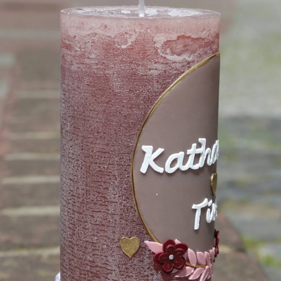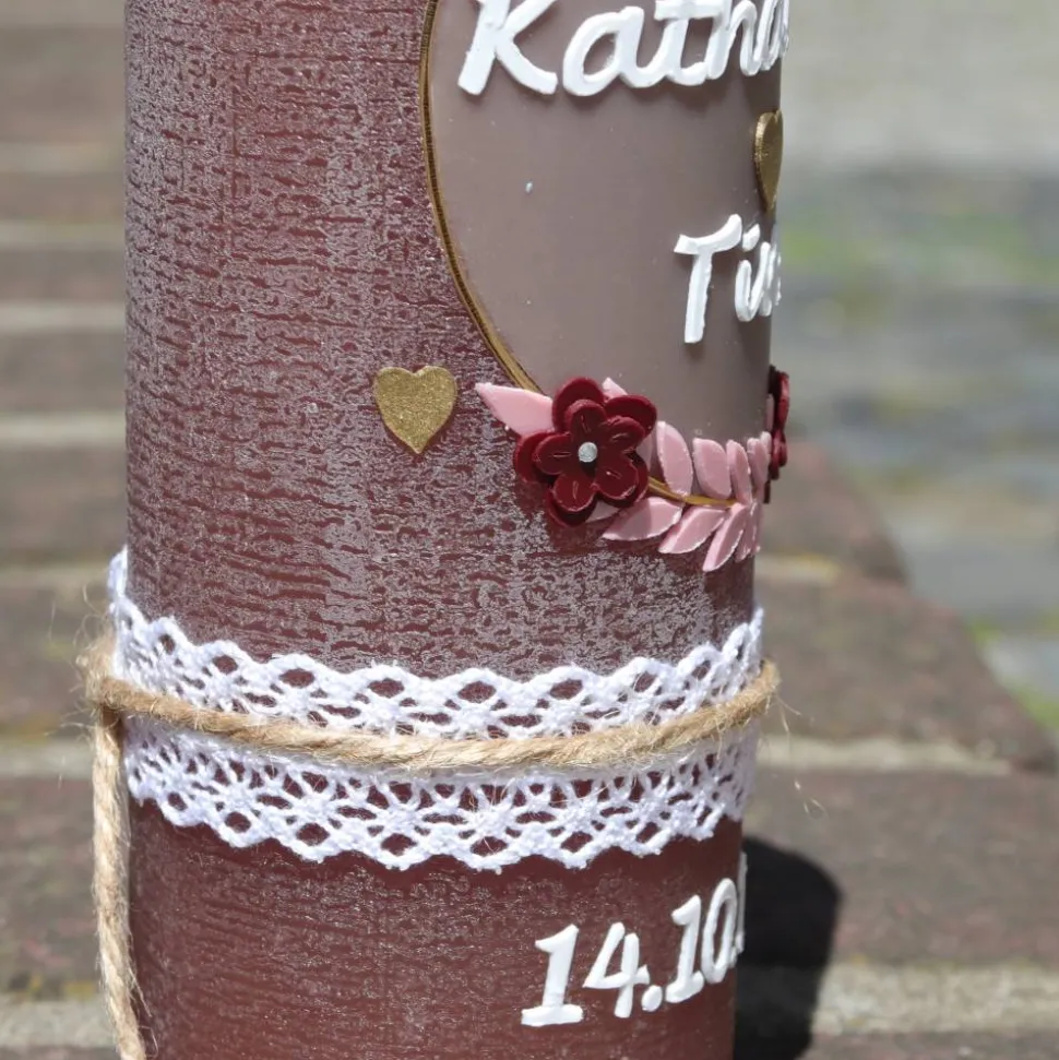 Die Verzierungen, gefertigt aus echtem Wachs und in mehreren Schichten in mühevoller Handarbeit angebracht, erzeugen einen beeindruckenden 3D-Effekt und erhöhen die Wertigkeit der Kerze. Diese Elemente zeugen von der Eleganz und Tiefe der Liebe, die Sie zueinander empfinden.