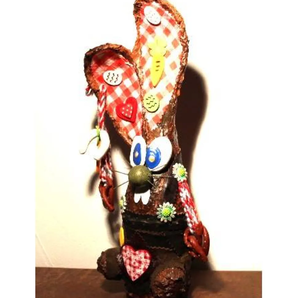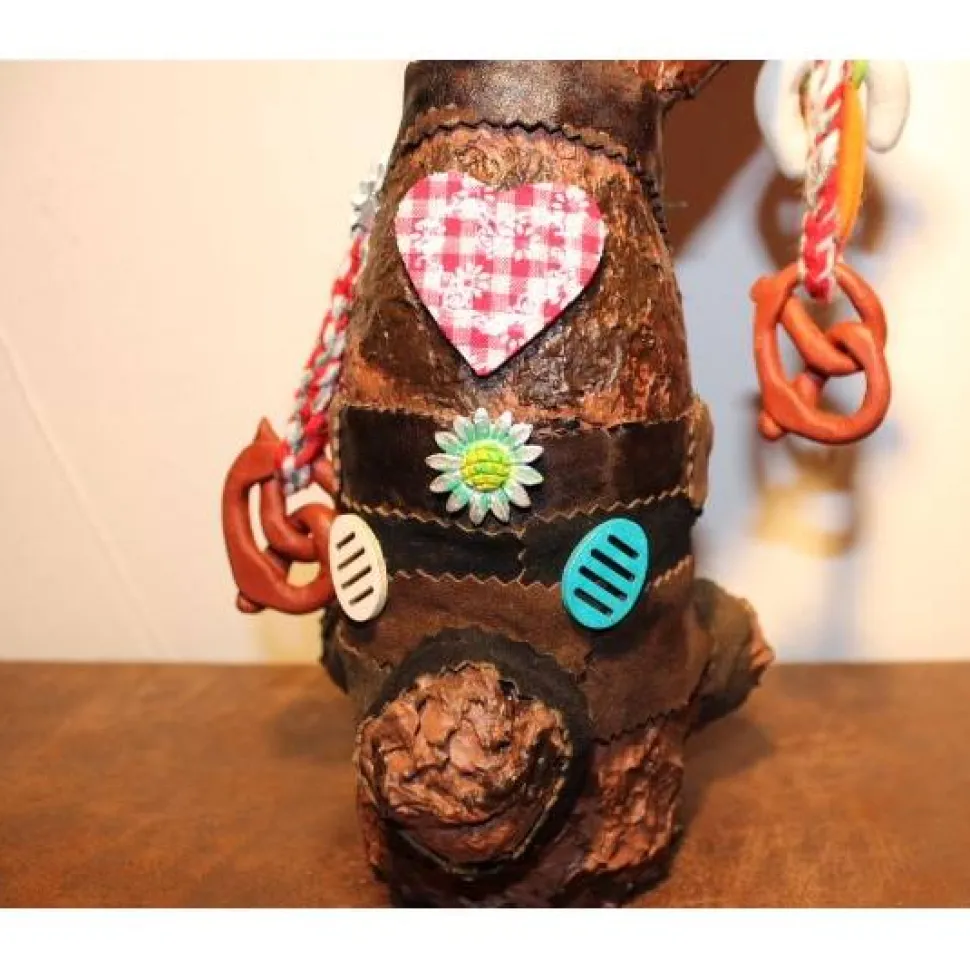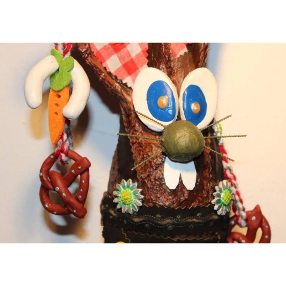 Das Haserl ist mit handgefertigten Weißwürsten, Brezn und Edelweiß aus Modelliermasse geschmückt. Nette Oster-Applikationen aus Filz und Holz runden das Bild des Bayernhaserls ab. Der Hase trägt eine „Lederhose“ aus Echt- und Kunstlederresten.