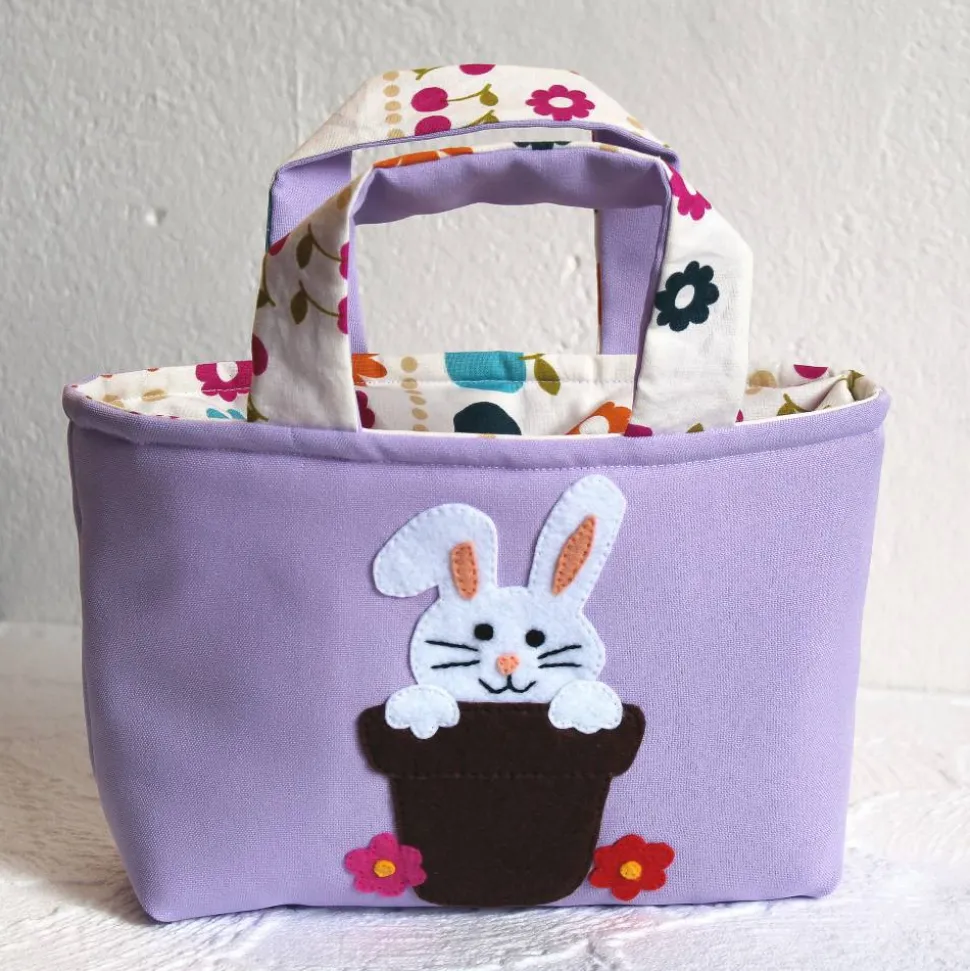 Die fliederfarbene Seite aus Baumwollstoff wurde mit einer Häschenapplikation aus Filz verziert. Wird das Täschchen umgestülpt kommt der Stoff mit den Blumen zur Geltung.