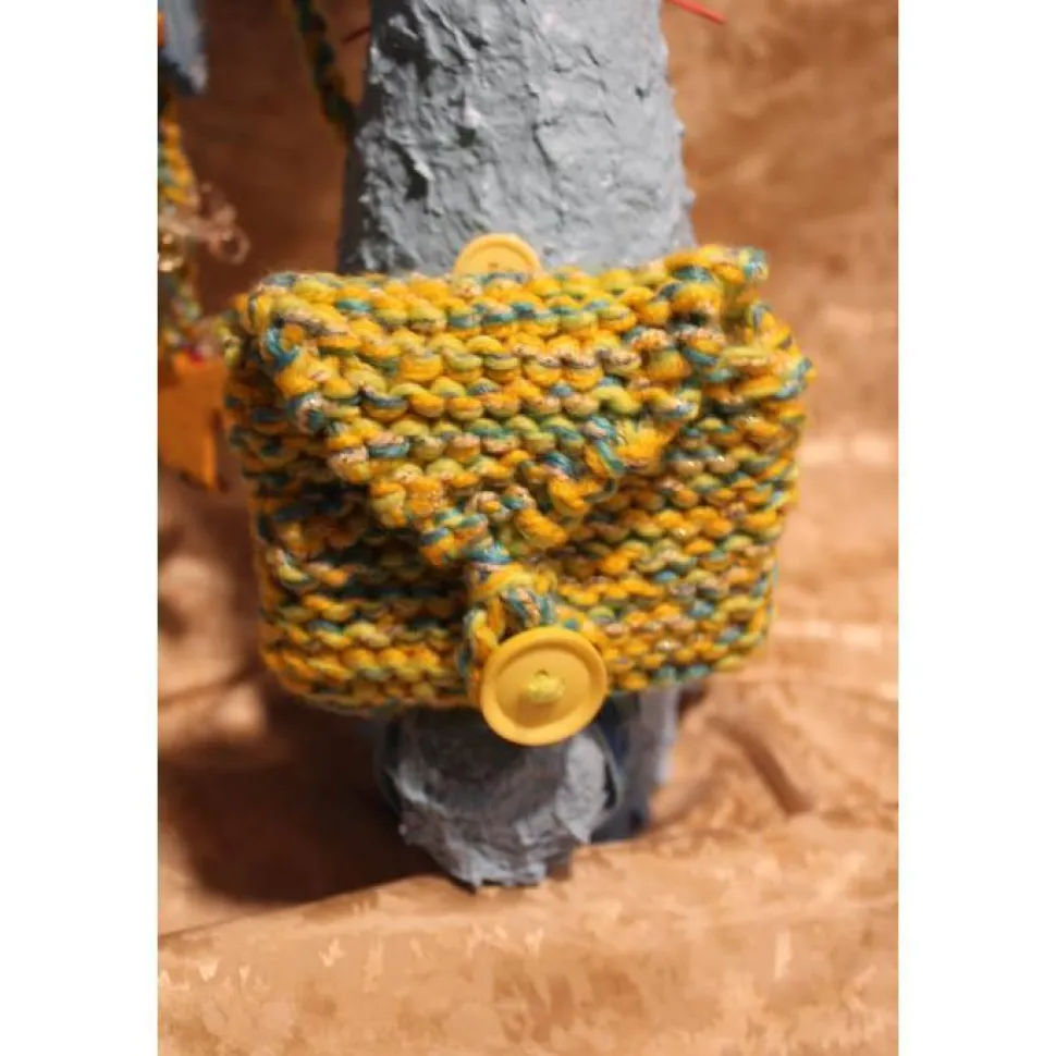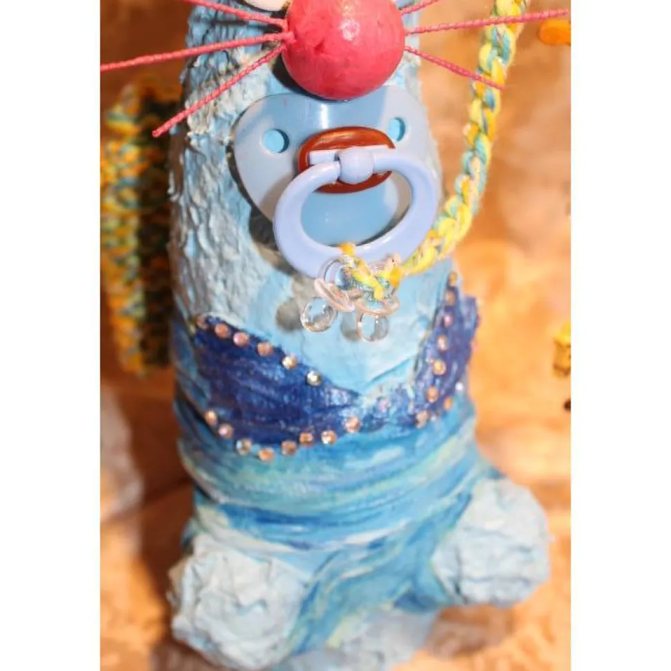 Verwendete, upgecycelte Materialien: Acrylfarben, Glasflasche, Papier, Milchtütenpapier, Plastikdeckel, Modelliermasse, Wolle, Baumwolle, Kunststoff.