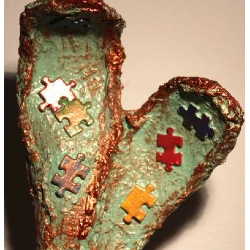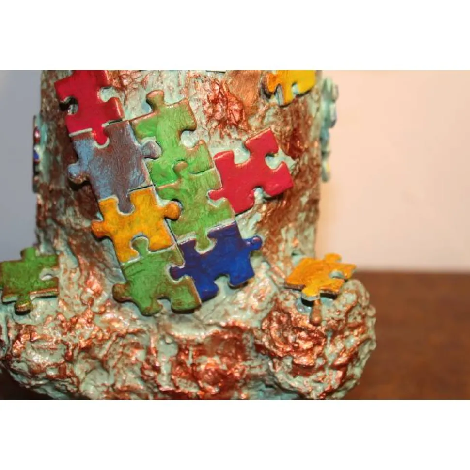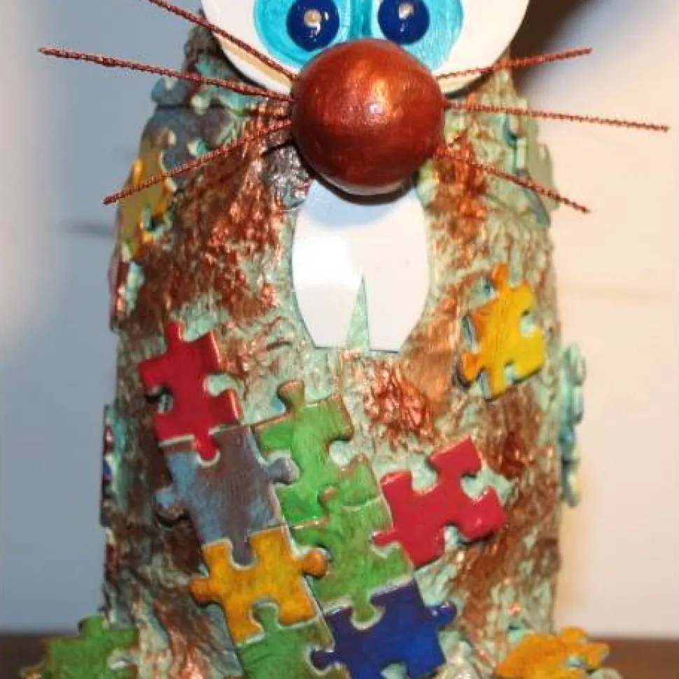 Witziges Upcycling-Projekt aus einer Glasflasche im Shabby-Stil, gestaltet mit Altpapier, Modelliermasse, Puzzleteilen und Acrylfarbe.