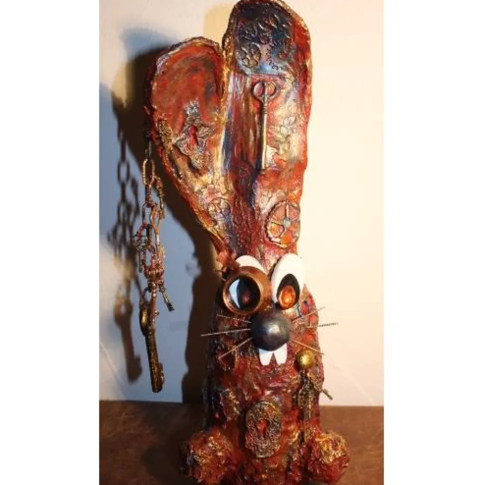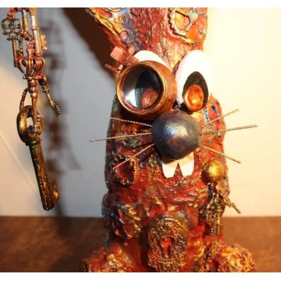 Das Haserl ist mit Zahnradabdrücken und Schlössern aus Modelliermasse dekoriert. Ideal für Steampunk-Fans ;). Eine Künstlerfigur der etwas anderen Art aus upgecycelten Materialien, wie Draht, Milchtütenpapier, Plastikdeckel, etc. !