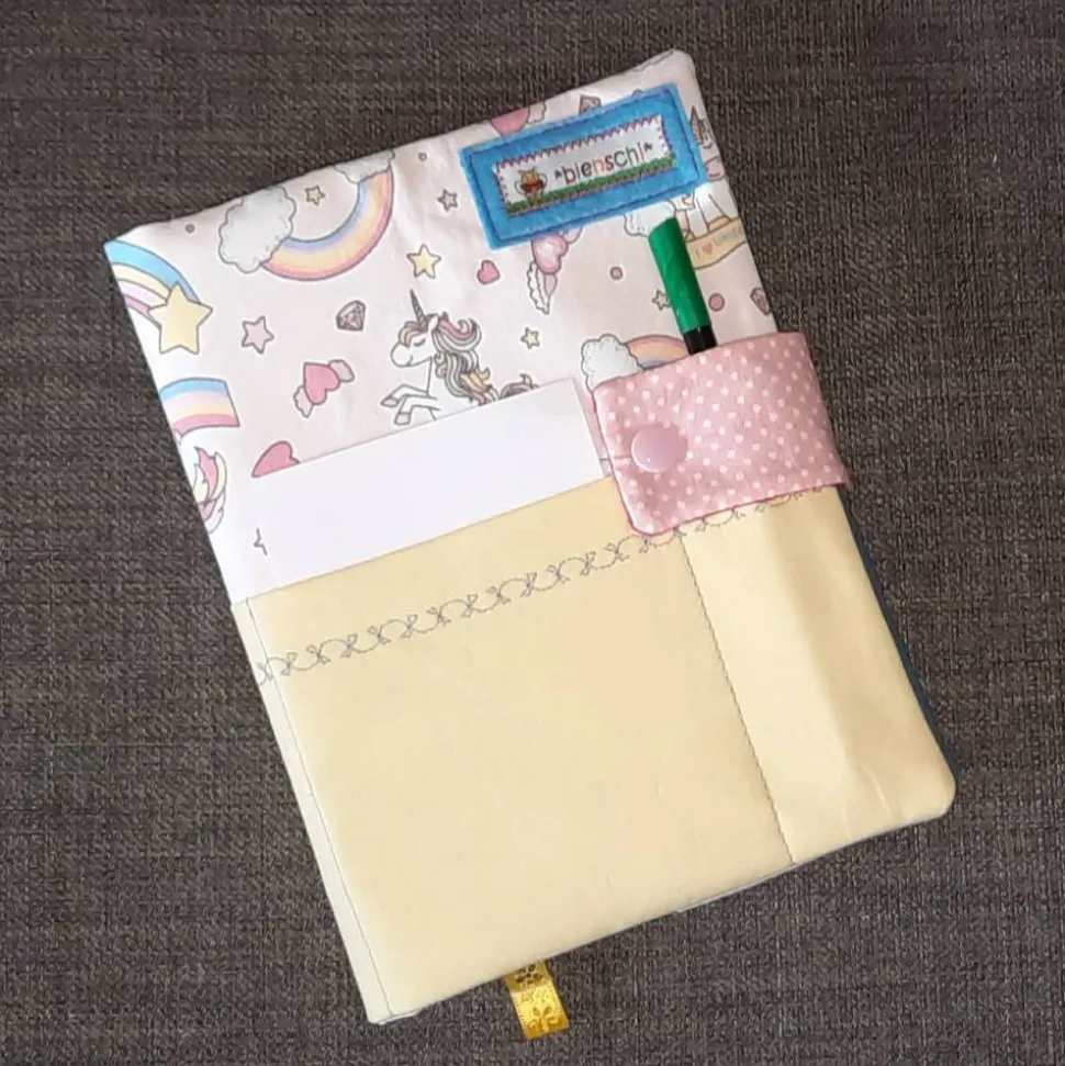 Sie kann gewaschen und gebügelt werden, es passen Hefte im Hochformat rein.