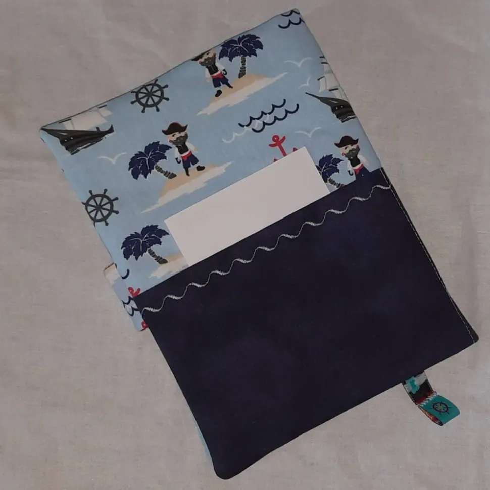Hellblauer Stoff mit Piratenmotiven in rot/ schwarz/ grau/ weiß/ dunkelblau, kombiniert mit dunkelblau und hellblau.