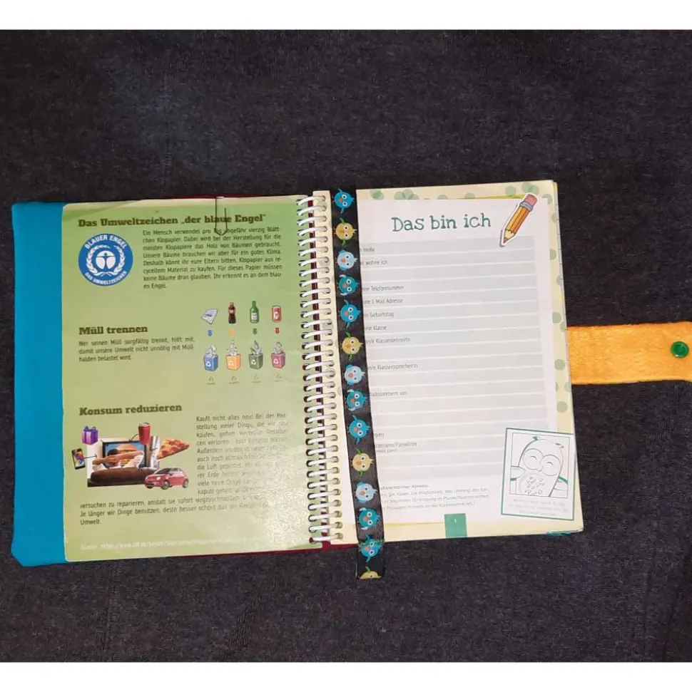 Achtung! Diese Hülle ist passend für ein Hausaufgabenheft mit Spiralbindung, da viele Schulen mittlerweile eigene Aufgabenhefte drucken lassen. Ich kann sie aber nochmal neu für normale Hefte anfertigen.