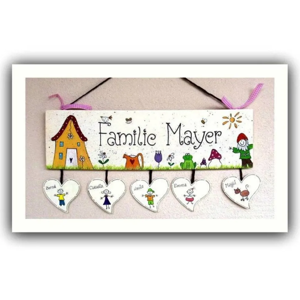 Verschenke ein einzigartiges Geschenk zum Einzug in das neue Haus oder die neue Wohnung! Mit diesem handbemalten Türschild Familie aus Holz mit Herzanhängern setzt du stilvolle und persönliche Akzente an jeder Haustür. Das Holzschild wird aufwendig per Hand beschriftet und bemalt – natürlich mit deinem Familiennamen und in deiner Wunschschriftart. Jeder Herzanhänger wird individuell mit Wunschfiguren und Vornamen gestaltet, bis zu sechs Herzchen nebeneinander sind möglich.