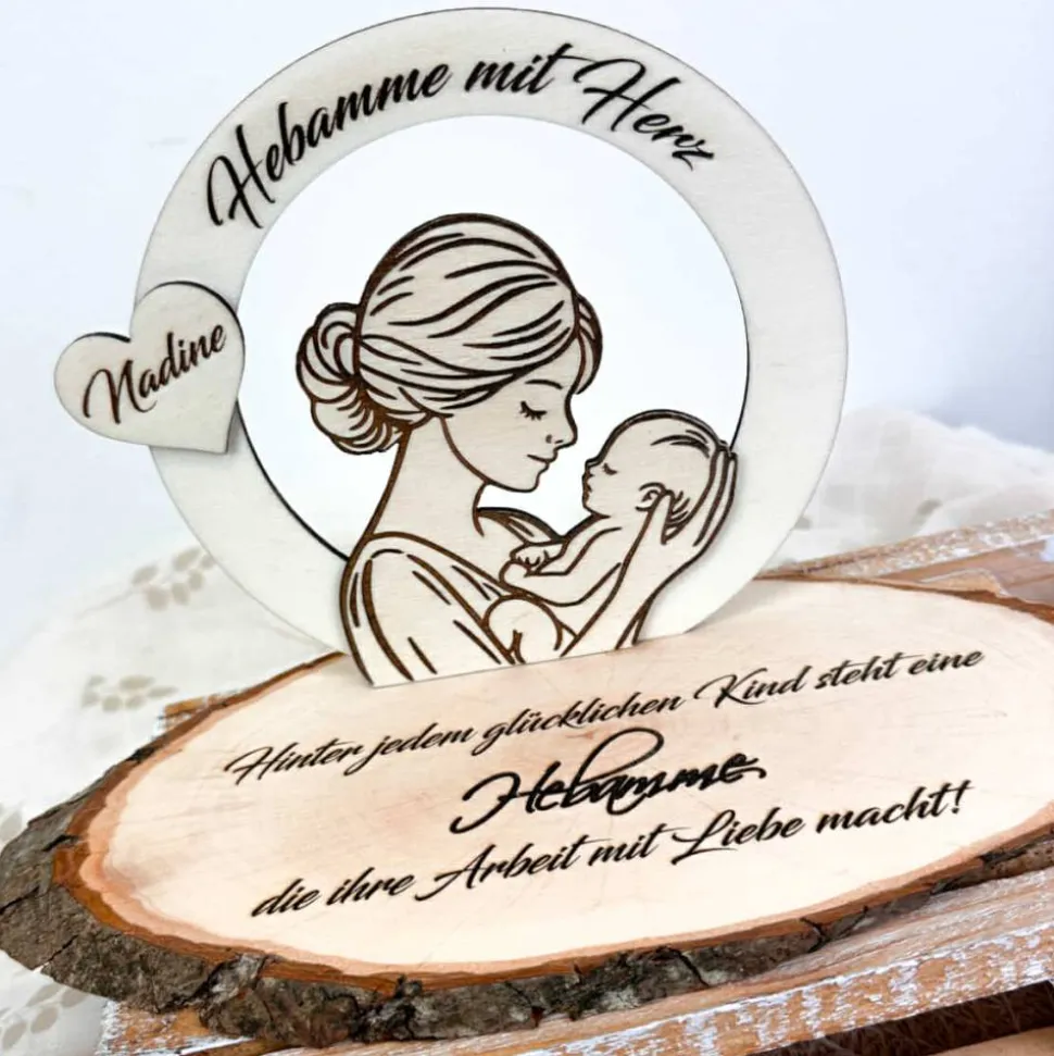 Die ovale Holzscheibe enthält einen schönen Spruch zum Thema „Hebamme“ und ist direkt auf das Holz eingraviert. Das Mutter Kind Symbol ist vor den Ring geklebt und erzieht somit einen 3D Effekt.