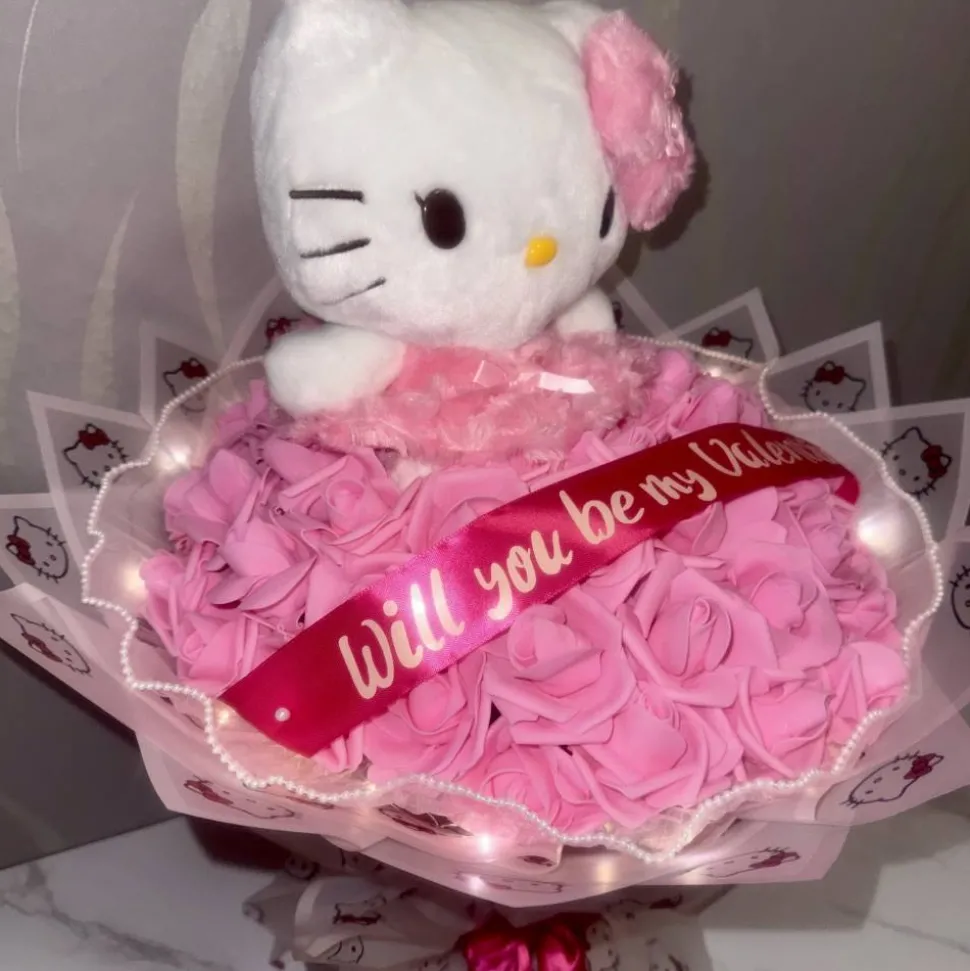Im Strauß integriert findest du eine süße Hello Kitty Figur sowie ein Banner mit dem liebevollen Schriftzug „Will u be my Valentine?“. Das Geschenkpapier im Hello Kitty-Design macht den Strauß zu einem echten Hingucker. Zusätzlich sorgt eine integrierte Lichterkette für einen bezaubernden Leuchteffekt und zaubert romantische Stimmung.
