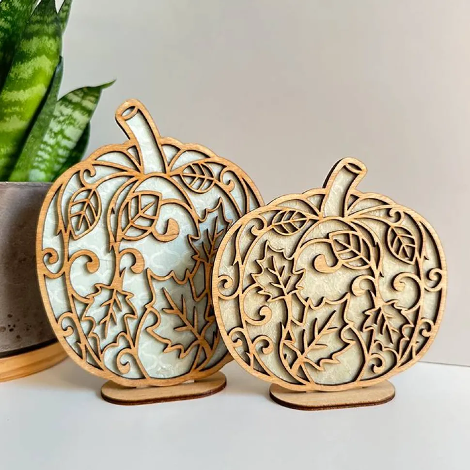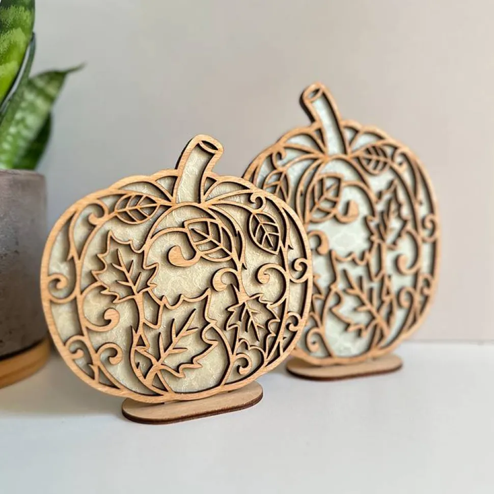 Die Blende mit filigranen Blättermotiven wird gebeizt und verklebt. Der Standfuß ist separat, die Kürbisse können ganz einfach eingesteckt werden und bei Bedarf selbst verklebt werden.