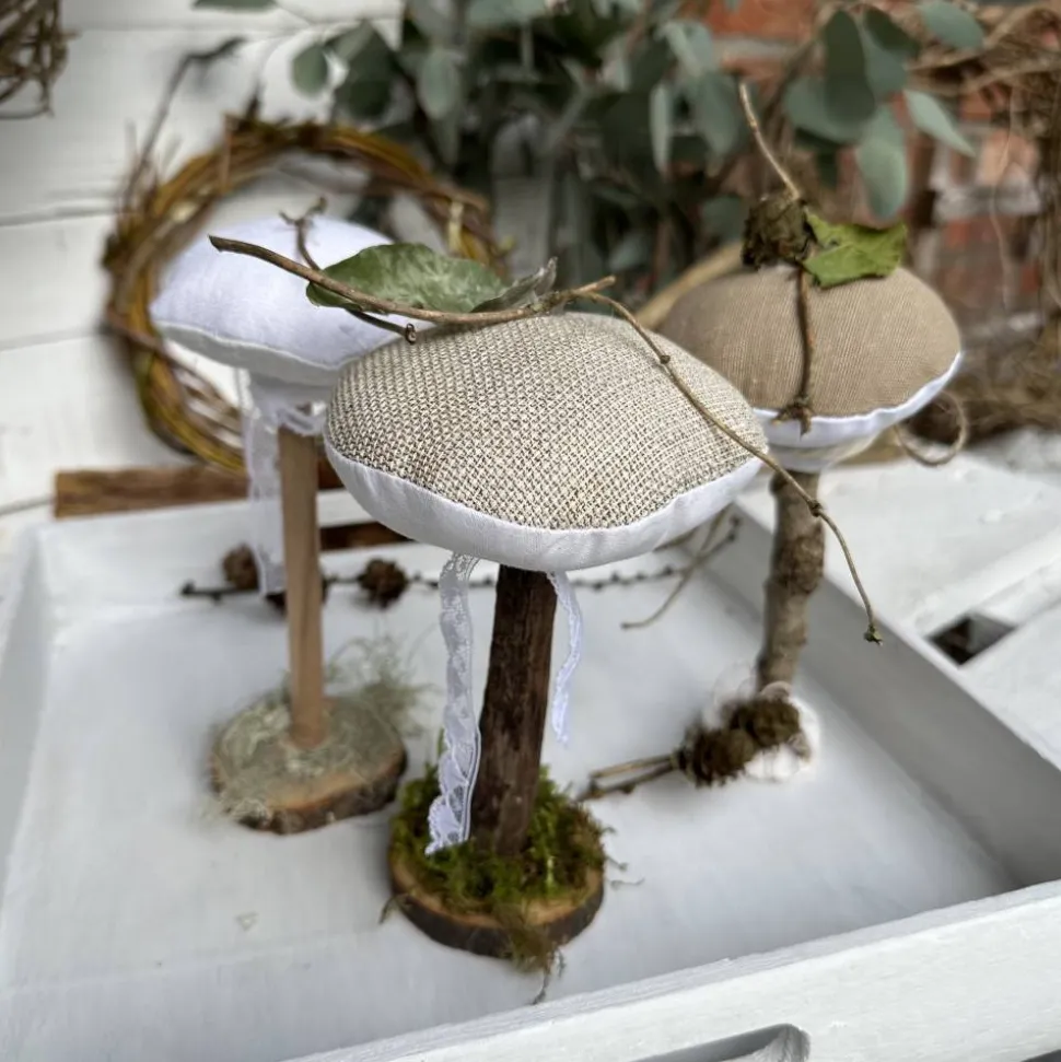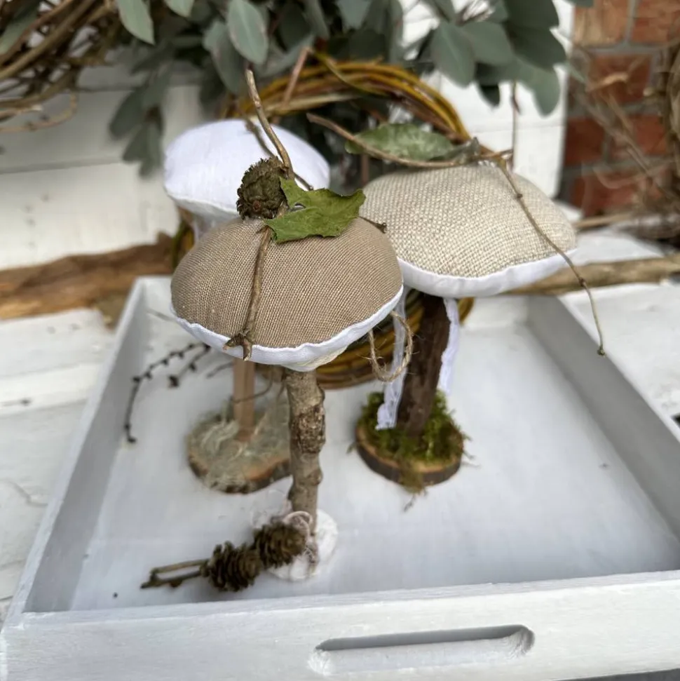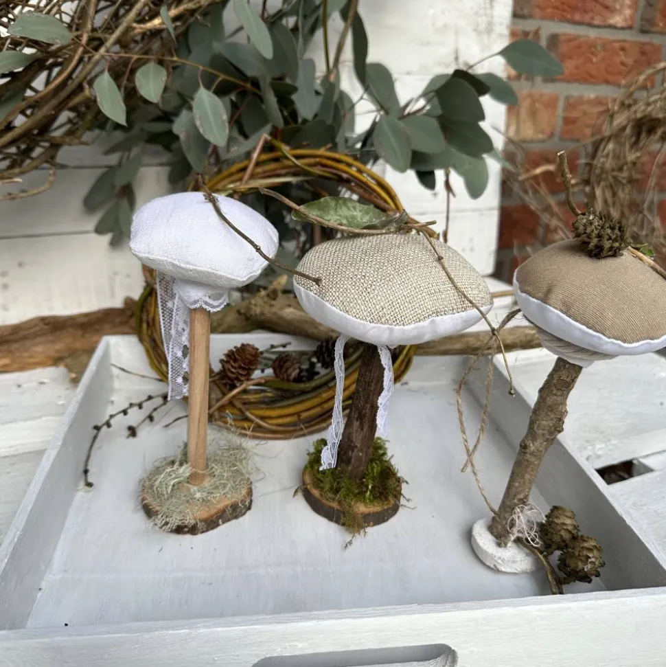Diese liebevoll handgefertigten Pilze sind das Highlight für Deinen herbstlichen und winterlichen Jahreszeitentisch im Landhausstil. Du bekommst ein einzigartiges Trio, verziert mit Naturmaterialien wie Blättern, Zweigen und Moos. Jedes Set ist ein Unikat und bringt natürlichen Charme in Dein Zuhause.